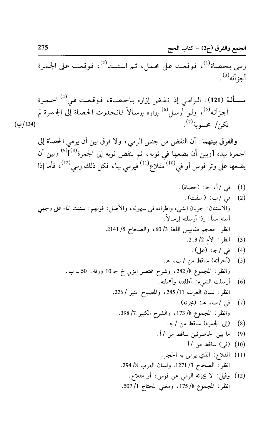 مسألة (١٢١): الرامي إذا نفض إزاره بالحصاة، فوقعت في الجمرة أجزأته ولو أرسل إزاره إرسالًا فانحدرت الحصاة إلى الجمرة لم تكن/ (١٢٤/ب) محسوبة.