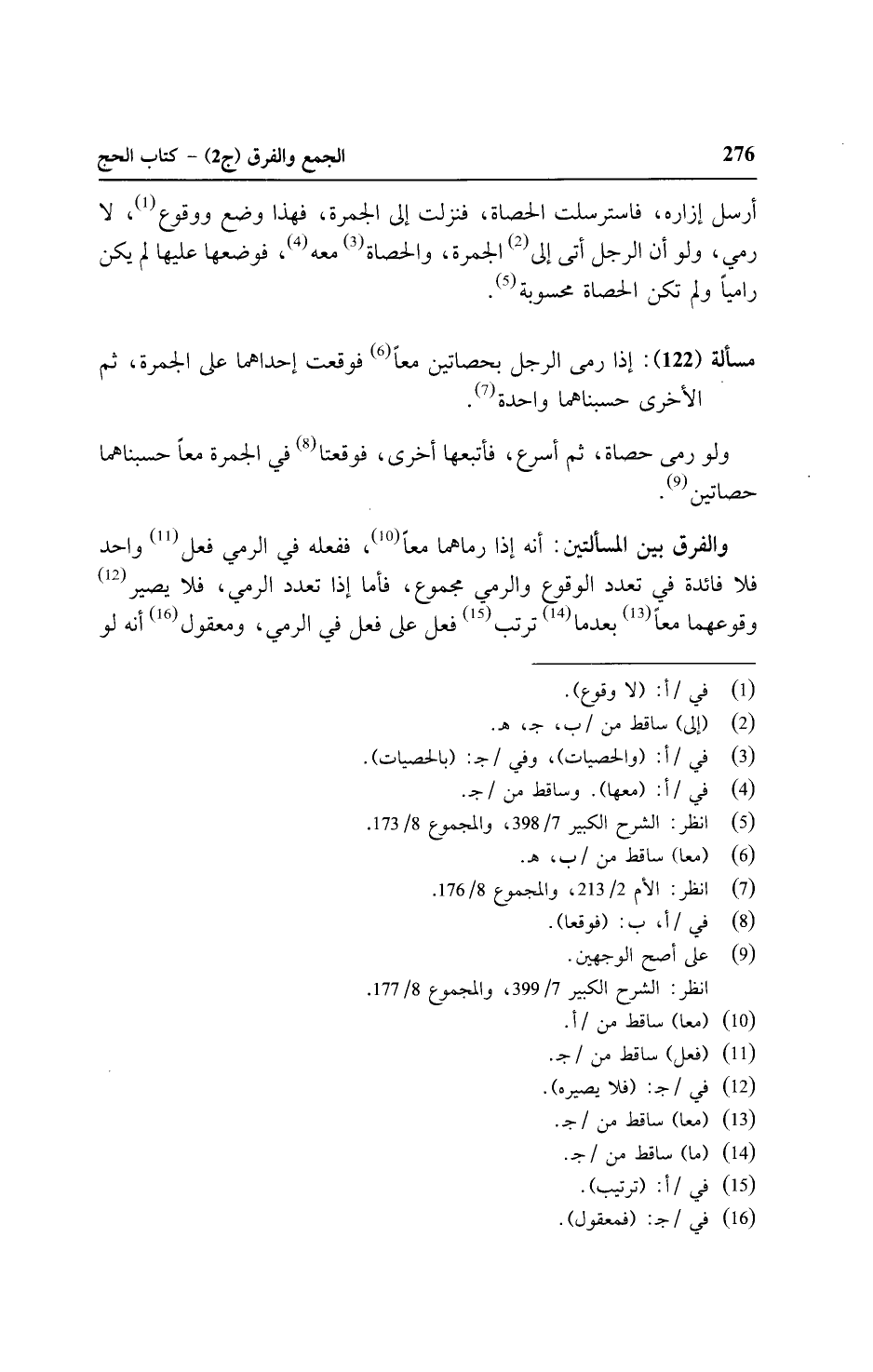 مسألة (١٢٢): إذا رمى الرجل بحصاتين معًا فوقعت إحداهما على الجمرة، ثم الأخرى حسبناهما واحدة.