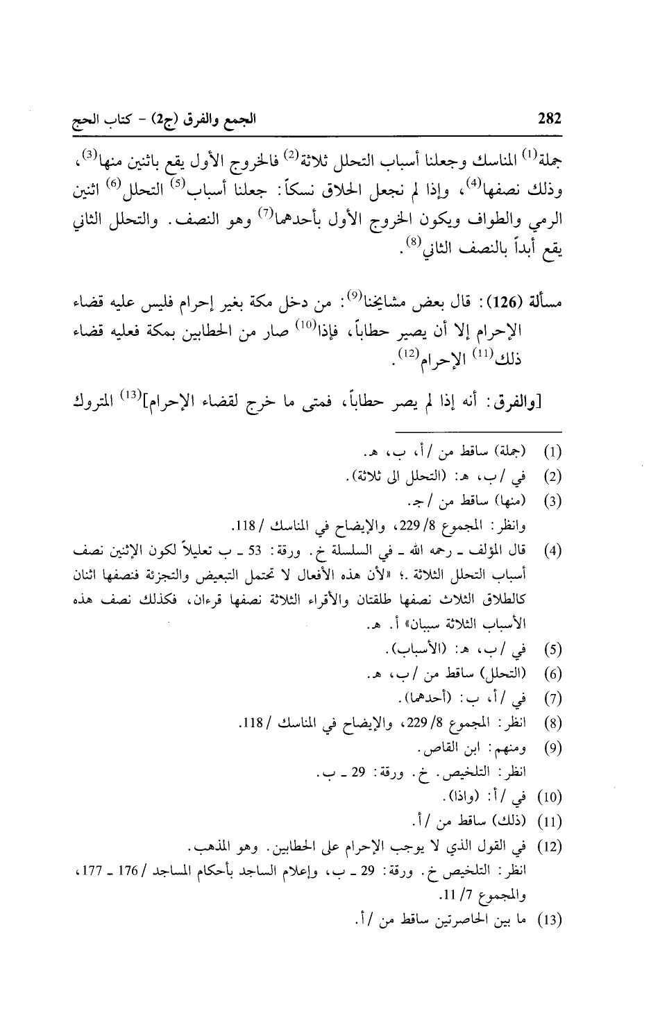 جملة المناسك وجعلنا أسباب التحلل ثلاثة فالخروج الأول يقع باثنين منها، وذلك نصفها، وإذا لم نجعل الحلاق نسكا: جعلنا أساب التحلل اثنين الرمي والطواف ويكون الخروج الأول بأحدهما وهو النصف. والتحلل الثاني يقع أبدًا بالنصف الثاني.