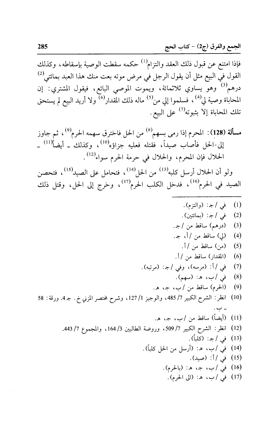 مسألة (١٢٨): المحرم إذا رمى بسهم من الحل فاخترق سهمه الحرم، ثم جاوز إلى الحل فأصاب صيدًا، فقتله فعليه جزاؤه وكذلك - أيضًا - الحلال فإن المحرم، والحلال في حرمة الحرم سواء.