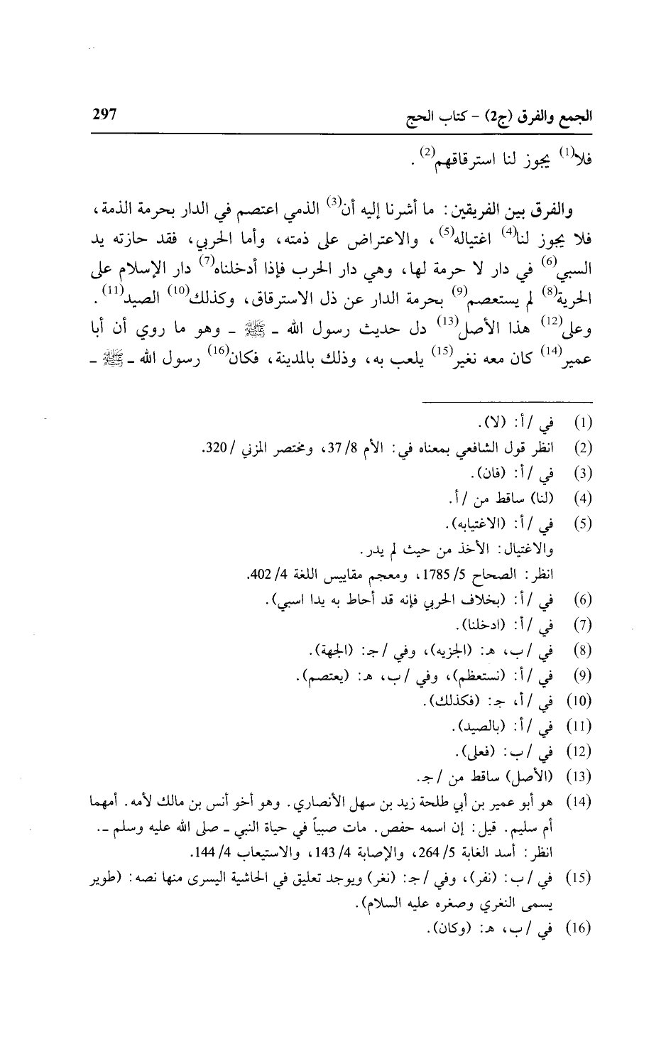 والفرق بين الفريقين: ما أشرنا إليه أن الذمي اعتصم في الدار بحرمة الذمة، فلا يجوز لنا اغتياله، والاعتراض على ذمته، وأما الحربي، فقد حازته يد السبي في دار لا حرمة لها، وهي دار الحرب فإذا أدخلناه دار الإسلام على الحرية لم يستعصم بحرمة الدار عن ذل الاسترقاق، وكذلك الصيد. وعلى هذا الأصل دل حديث رسول الله صلى الله عليه وسلم - وهو ما روي أن أبا عمير كان معه نغير يلعب به، وذلك بالمدينة، فكان رسول الله - صلى الله عليه وسلم -