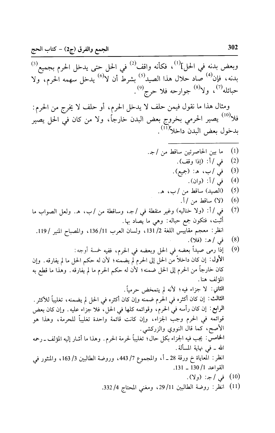 وبعض بدنه في الحل]، فكأنه واقف في الحل حتى يدخل الحرم بجميع بدنه، فإن صاد حلال هذا الصيد بشرط أن لا يدخل سهمه الحرم، ولا حبائله، ولا جوارحه فلا حرج.