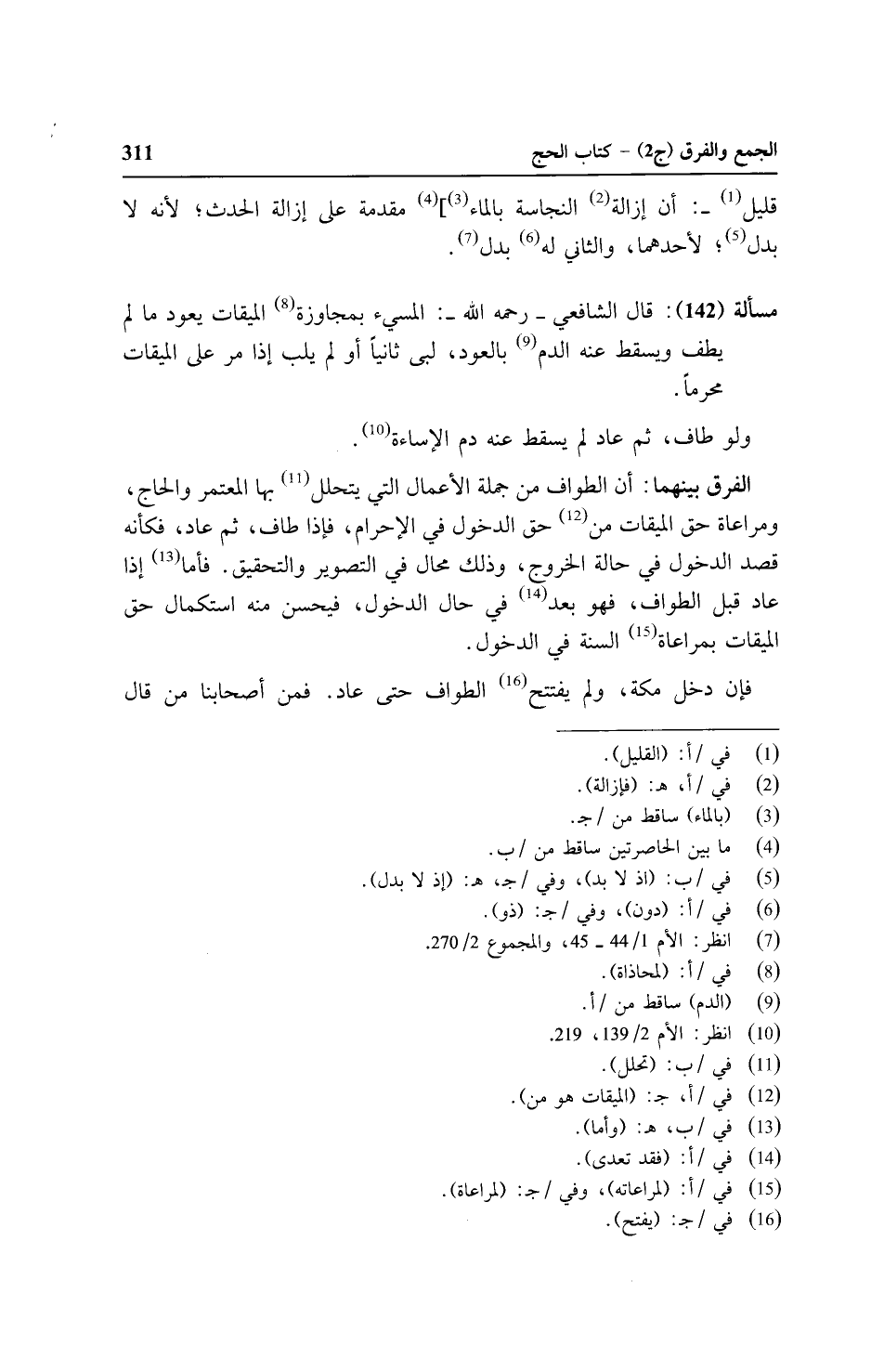مسألة (١٤٢): قال الشافعي -رحمه الله -: المسيء بمحاورة الميقات يعود ما لم يطف ويسقط عنه الدم بالعود، لبى ثانياً إذا مر على الميقات محرماً.