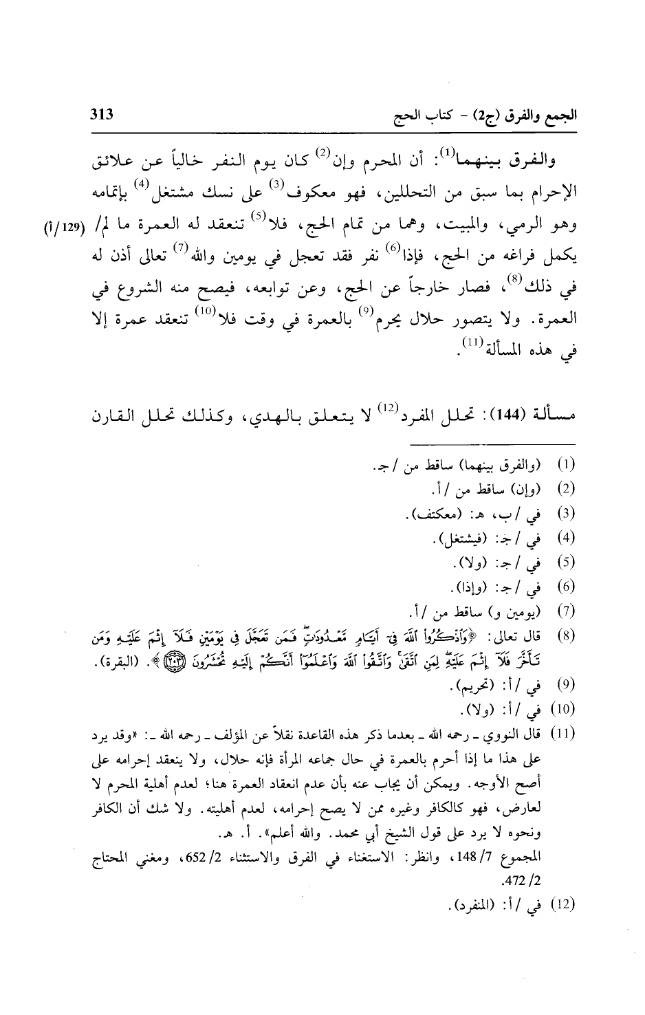 والفرق بينهما: أن المحرم وإن كان يوم النفر خالياً عن علائق الإحرام بما سبق من التحللين، فهو معكوف على نسك بإتمامه وهو الرمي، والمبيت، وهما من تمام الحج، فلا تنعقد له العمرة ما لم/ (١٢٩/أ) يكمل فراغه من الحج، فإذا نفر فقد تعجل في يومين والله تعالى أذن له في ذلك، فصار خارجاً عن الحج، وعن توابعه، فيصح منه الشروع في العمرة. ولا يتصور حلال يحرم بالعمرة في وقت تنعقد عمرة إلا في هذه المسألة.