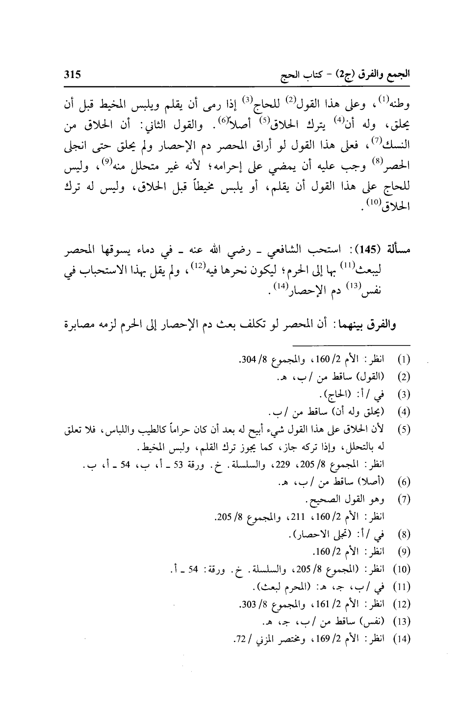 مسألة (١٤٥): استحب الشافعي -رضي الله عنه - في دماء يسوقها المحصر ليبعث بها إلى الحرم؛ ليكون نحرها فيه، ولم يقل بهذا الاستحباب في نفس دم الإحصار.