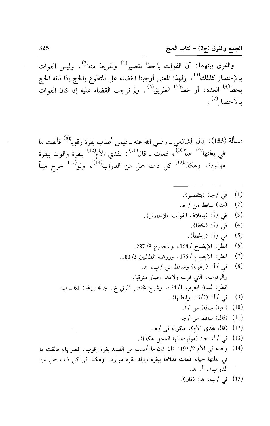 مسألة (١٥٣): قال الشافعي - رضي الله عنه - فيمن أصاب بقرة ركوبا فألقت ما في بطنها حياً، فمات - قال: يفدي الأم ببقرة والوالد ببقرة مولودة، وهكذا كل ذات حمل من الدواب، ولو خرج ميتاً
