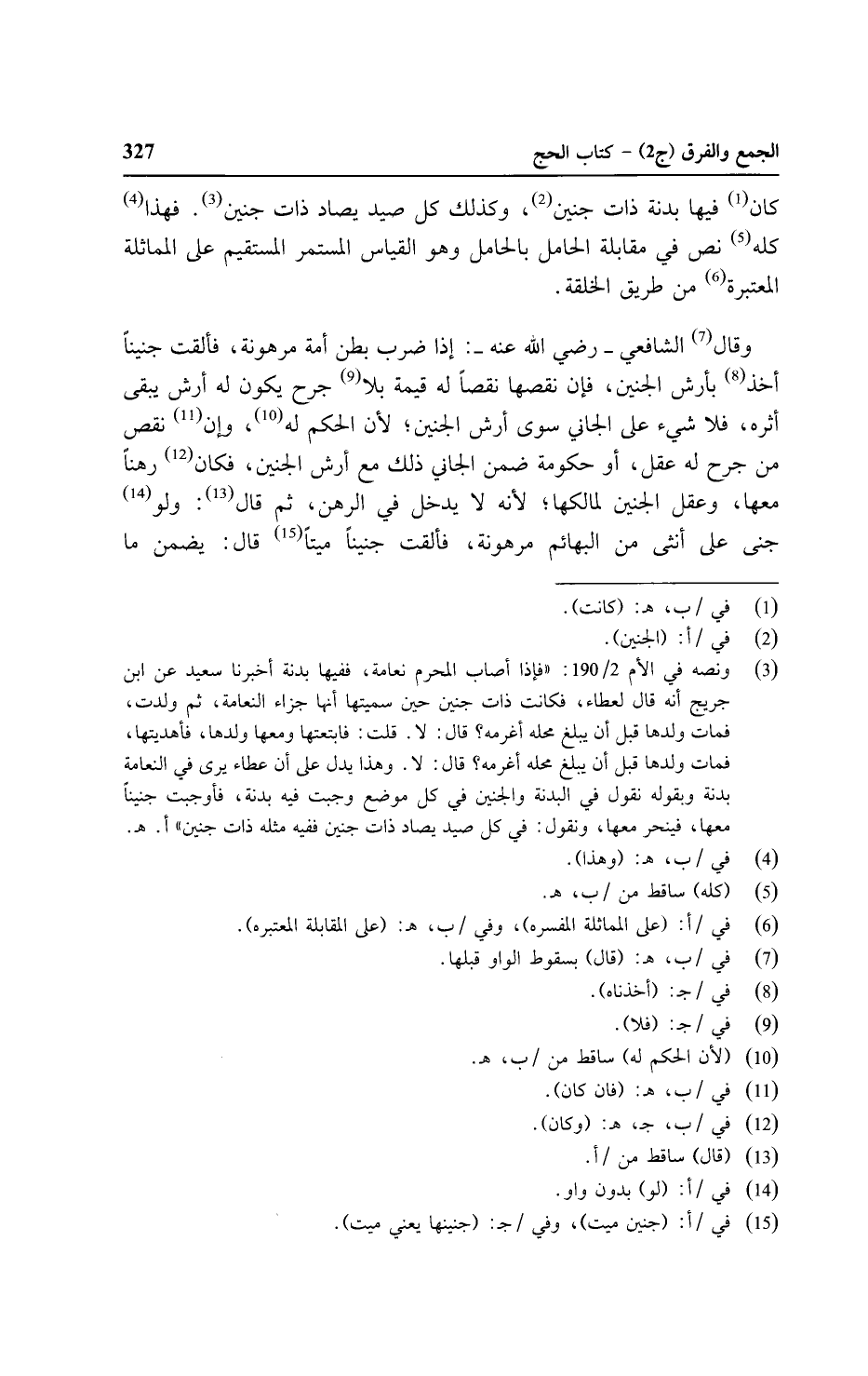 كان فيها بدنه ذات جنين، وكذلك كل صيد ذات جنين. فهذا كله نص في مقابله الحامل بالحامل وهو القياس المستمر المستقيم على المماثلة المعتبرة من طريق الخلقة.