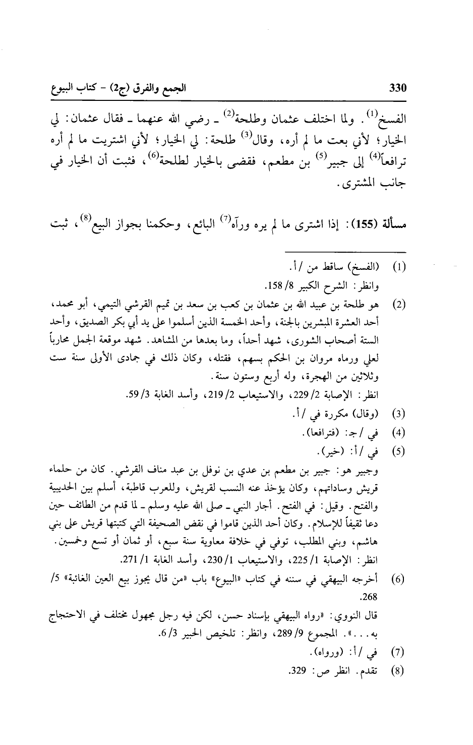 الفسخ. ولما اختلف عثمان وطلحة -رضي الله عنهما - فقال عثمان: لي الخيار؛ لأني بعت ما لم أره، وقال طلحة: لي خيار؛ لأني اشتريت ما لم أره ترافعاً إلى جبير بن مطعم، فقضى بالخيار لطلحة، فثبت أن الخيار في جانب المشترى.
