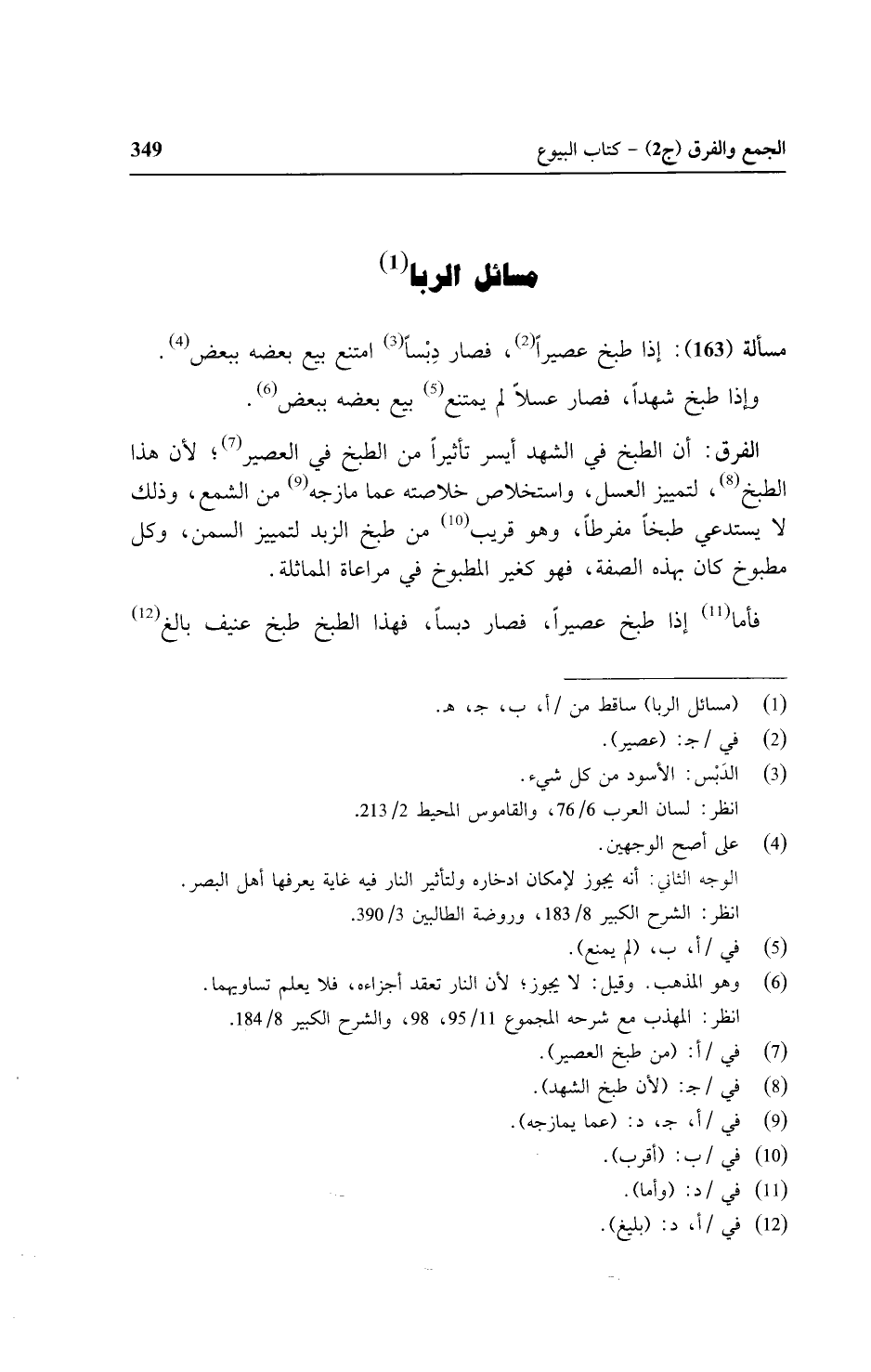مسألة (١٦٣): إذا طبخ عصيراً، فصار دبس امتنع بيع بعضه ببعض. وإذا طبخ شهداً، فصار عسلاً لم يمتنع بيع بعضه ببعض.