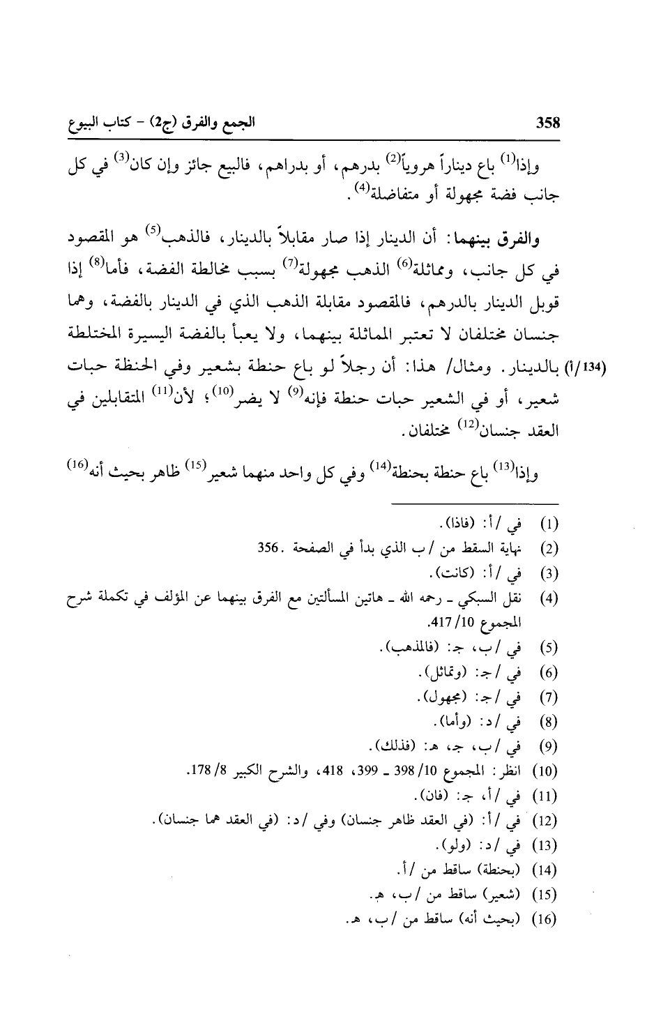 والفرق بينهما: أن الدينار إذا صار مقابلاً بالدينار، فالذهب هو المقصود في كل جانب، ومماثلة الذهب مجهولة بسبب مخالطة الفضة، فأما إذا قوبل الدينار بالدرهم، فالمقصود مقابلة الذهب الذي في الدينار بالفضة، وهما جنسان مختلفان لا تعتبر المماثلة بينهما، ولا يعبأ بالفضة اليسيرة المختلطة بالدينار. ومثال/ (١٣٤/أ) هذا: أن رجلاً لو باع حنطة بشعير وفي الحنطة حبات شعير، أوفي الشعير حبات حنطة فأنه لا يضر؛ لأن المتقابلين في العقد جنسان مختلفان.