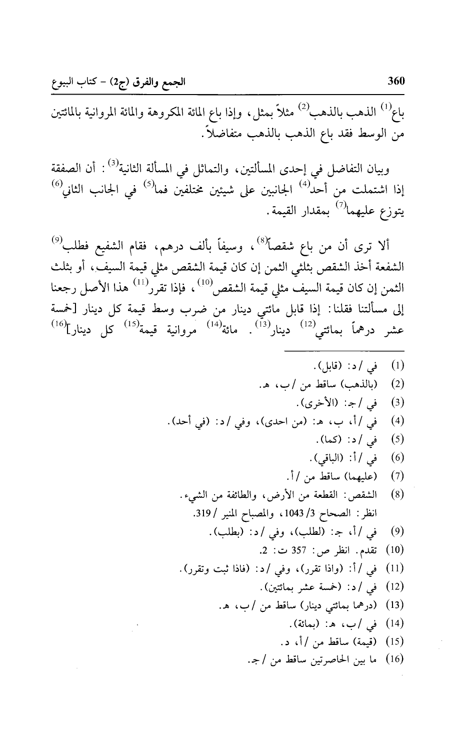 ألا تري أن من باع شقصا، وسيفاً بألف درهم، فقام الشفيع فطلب الشفعة أخذ الشقص بثلثي الثمن إن كان قيمة الشقص مثلي قيمة السيف، أو بثلث الثمن إن كان قيمة السيف مثلي قيمة الشقص، فإذا تقرر هذا الأصل رجعنا إلي مسألتنا فقلنا: إذا قابل مائتي دينار من ضرب وسط قيمة كل دينار [خمسة عشر درهماً بمائتي دينار. مائة مروانية قيمة كل دينار]