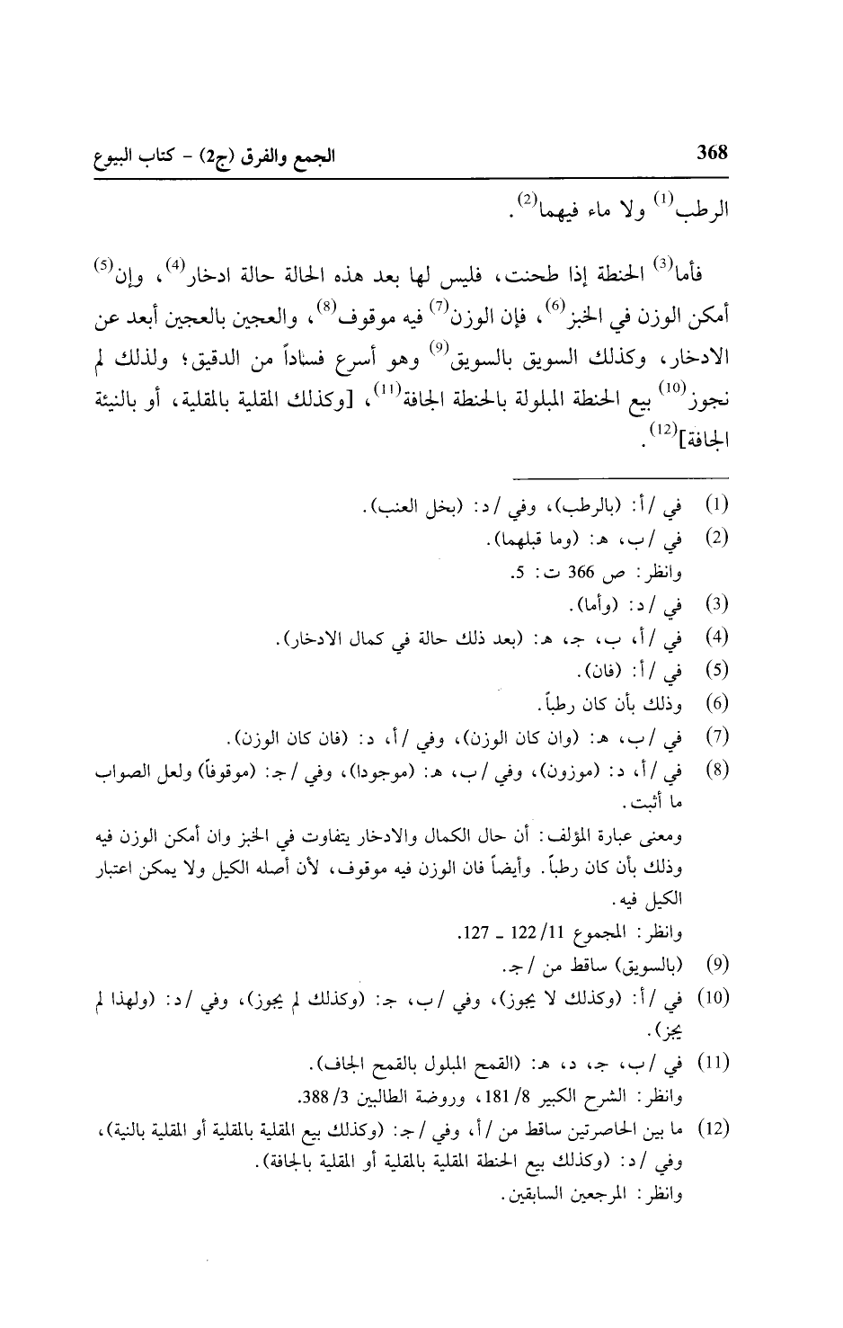 فأما الحنطة إذا طحنت، فليس لها بعد هذه الحالة حالة ادخار، وإن أمكن الوزن في الخبز، فإن الوزن فيه موقوف، والعجين بالعجين أبعد عن الادخار، وكذلك السويق بالسويق وهو أسرع فسادًا من الدقيق؛ ولذلك نجوز بيع الحنطة المبلولة بالحنطة الجافة، [وكذلك المقلية بالمقلية، أو بالنيئة الجافة].