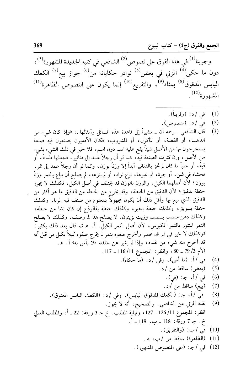 وجرينا في هذا الفرق على نصوص الشافعي في كتبه الجديدة المشهورة، دون ما حكي المزني في بعض نوادر حكاياته من جواز بيع الكعك اليابس المدقوق بمثله، والتفريع إنما يكون على النصوص الظاهرة المشهورة.