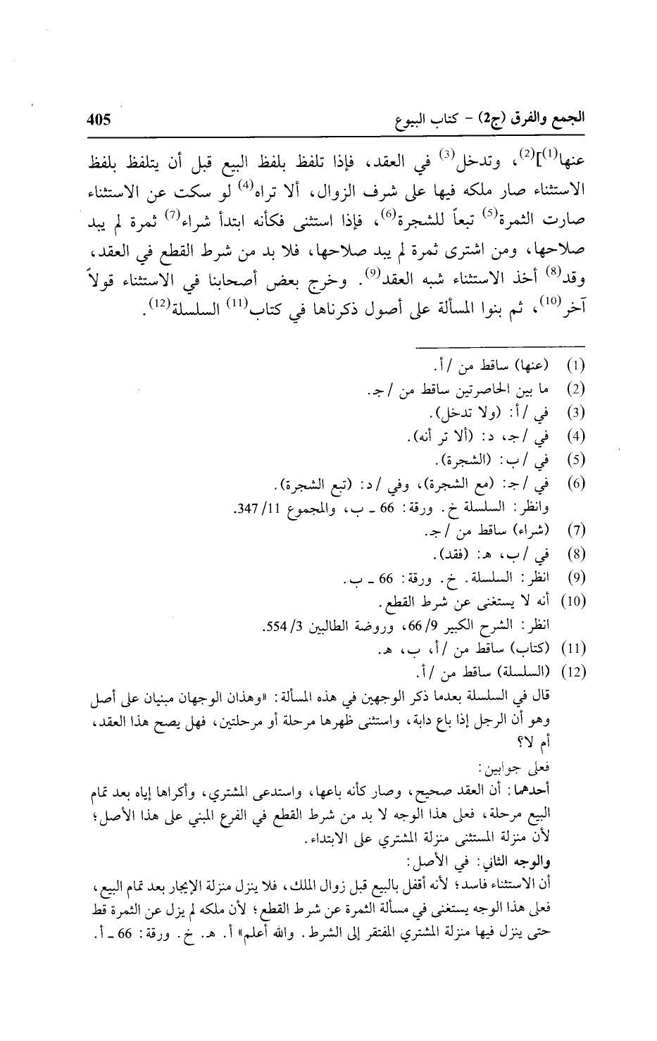 عنها]، وتدخل في العقد، فإذا تلفظ بلفظ البيع قبل أن يتلفظ بلفظ الاستثناء صار ملكه فيها على شرف الزوال، ألا تراه لو سكت عن الاستثناء صارت الثمرة تبعًا للشجرة، فإذا استثنى فكأنه ابتدأ شراء ثمرة لم يبد صلاحها، ومن اشترى ثمرة لم يبد صلاحها، فلابد من شرط القطع في العقد، وقد أخذ الاستثناء شبه العقد. وخرج بعض أصحابنا في الاستثناء قولًا آخر، ثم بنوا المسألة على أصول ذكرناها في كتاب السلسلة.