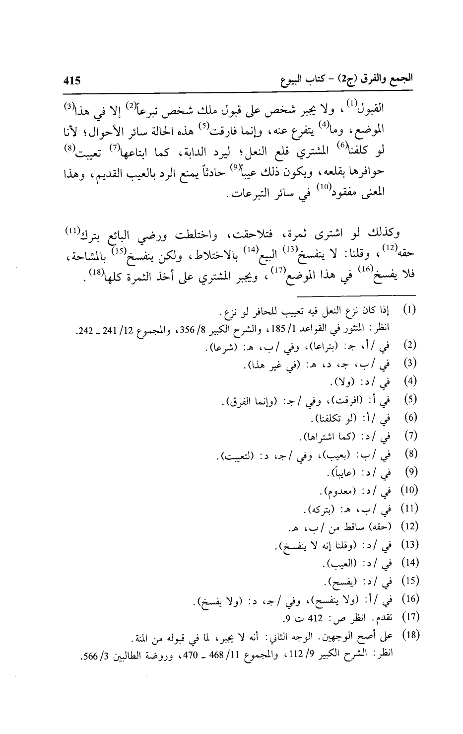 القبول, ولا يجبر شخص على قبول ملك شخص تبرعًا إلا في هذا الموضع, وما يتفرع عنه, وإنما فارقت هذه الحالة سائر الأحوال؛ لأنا لو كلفنا المشتري قلع النعل؛ ليرد الدابة, كما ابتاعها تعيبت حوافرها بقلعة, ويكون ذلك عيبًا حادثًا يمنع الرد بالعيب القديم, وهذا المعنى مفقود في سائر التبرعات.