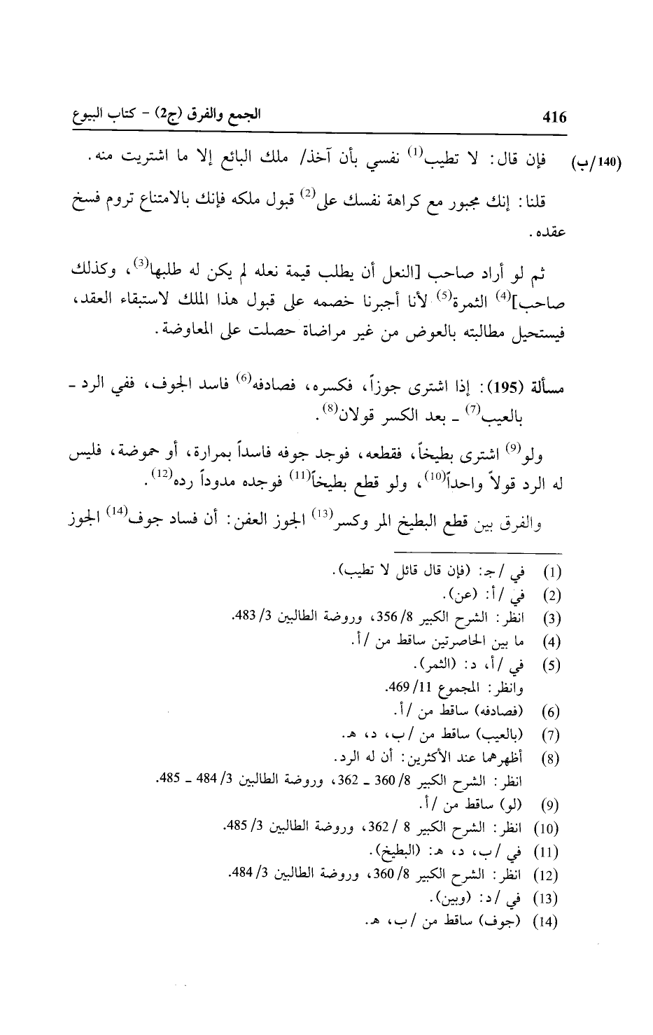 ثم لو أراد صاحب] النعل أن يطلب قيمة نعله لم يكن له طلبها, وكذلك صاحب [الثمرة لأنا أجبرنا خصمه على قبول هذا الملك لاستبقاء العقد, فيستحيل مطالبته بالعوض من غير مراضاة حصلت على المعاوضة.