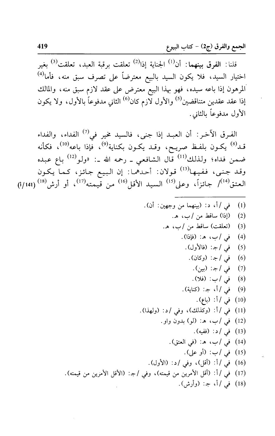 الفرق الآخر: أن العبد إذا جني, فالسيد مخير في الفداء, والفداء قد يكون بلفظ صريح, وقد يكون بكناية, فإذا باعه فكأنه ضمن فداه؛ ولذلك قال الشافعي - رحمه الله -: "ولو باع عبده وقد جني, ففيها قولان: أحدهما: إن البيع جائز, كما يكون العتق/ (١٤١ - أ) جائزًا, وعلى السيد الأقل من قيمته, أو أرش