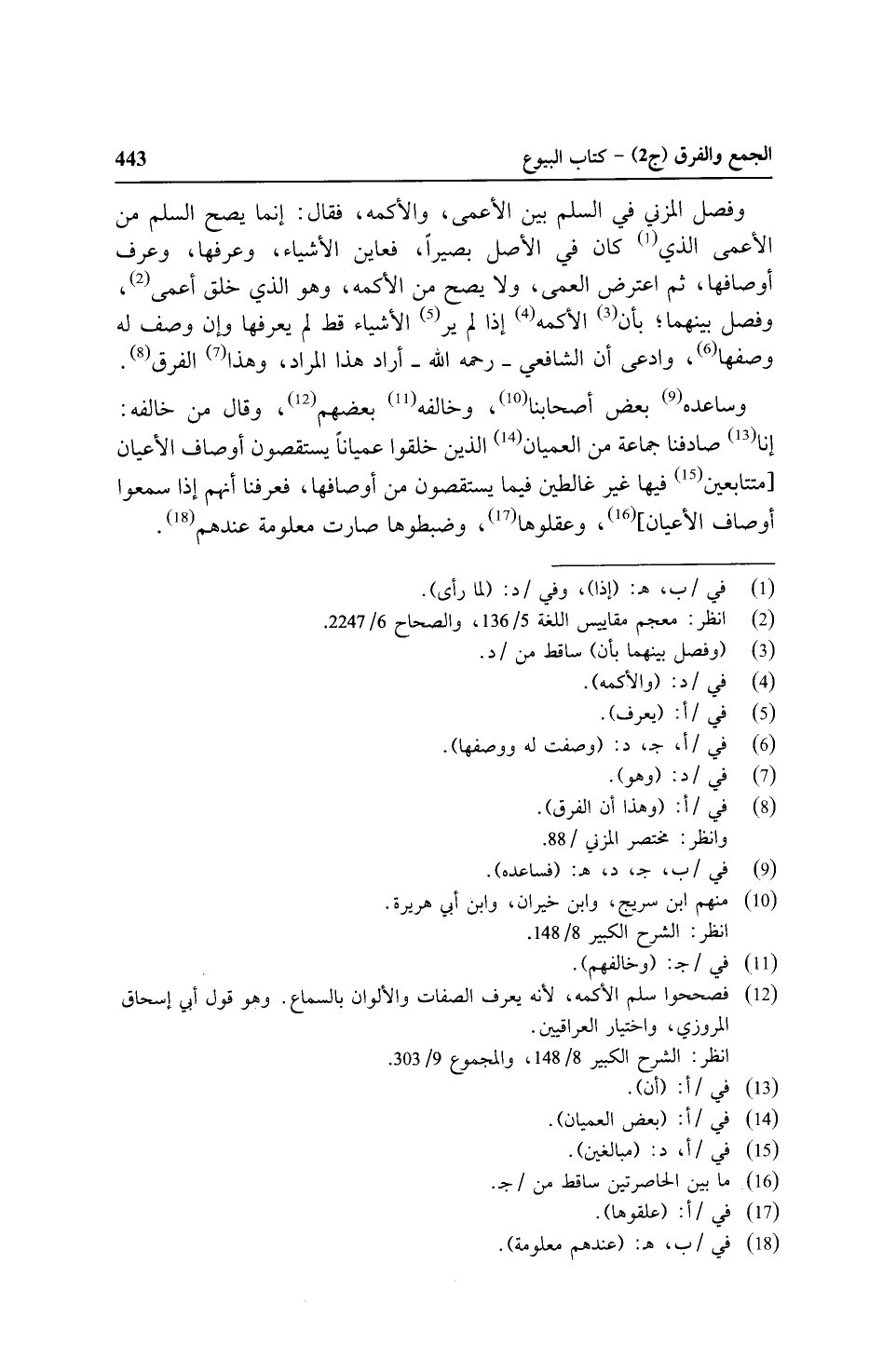 وفصل المزني في السلم بين الأعمى، والأكمه، فقال: إنما يصح السلم من الأعمى الذي كان في الأصل بصيرًا، فعاين الأشياء، وعرفها، وعرف أوصافها، ثم اعترض العمى، ولا يصح من الأكمه، وهو الذي خلق أعمى، وفصل بينهما؛ بأن الأكمه إذا لم ير الأشياء قط لم يعرفها وإن وصف له وصفها، وادعى أن الشافعي - رحمه الله - أراد هذا المراد، وهذا الفرق.