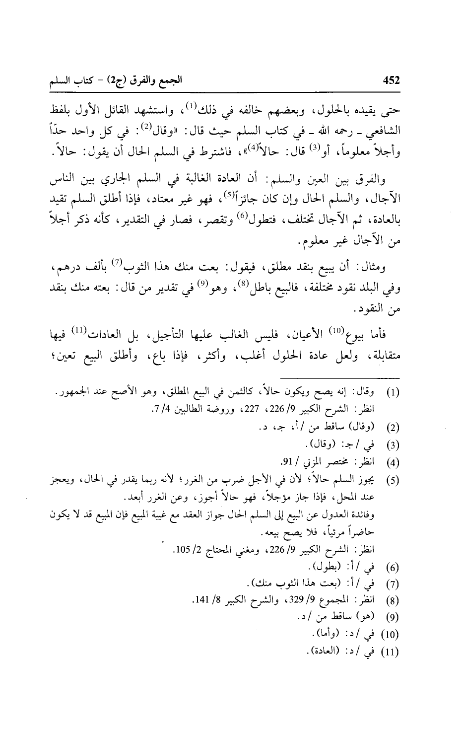 حتى يقيده بالحلول، وبعضهم خالفه في ذلك، واستشهد القائل الأول بلفظ الشافعي - رحمه الله - في كتاب السلم حيث قال: "وقال: في كل واحد حدًا وأجلًا معلومًا، أو قال: حالًا"، فاشترط في السلم الحال أن يقول: حالًا.
