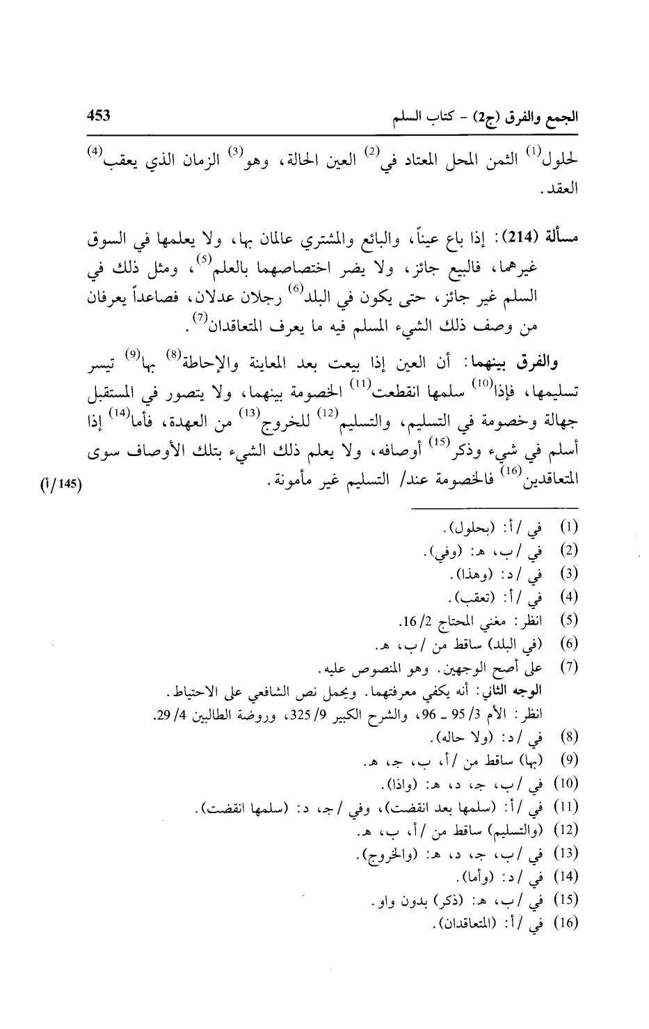 والفرق بينهما: أن العين إذا بيعت بعد المعاينة والإحاطة بها تيسر تسليمها، فإذا سلمها انقطعت الخصومة بينهما، ولا يتصور في المستقبل جهالة وخصومة في التسليم، والتسليم للخروج من العهدة، فأما إذا أسلم في شيء وذكر أوصافه، ولا يعلم ذلك الشيء بتلك الأوصاف سوى المتعاقدين فالخصومة عند/ (١٤٥/ أ) التسليم غير مأمونة.