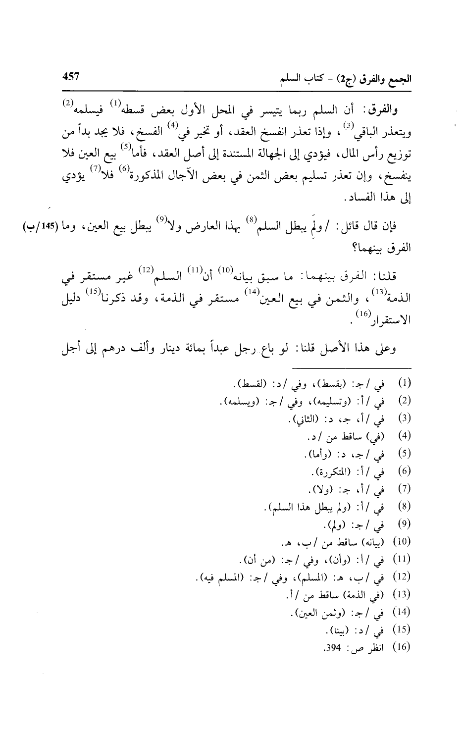 قلنا: الفرق بينهما: ما سبق بيانه أن السلم غير مستقر في الذمة، والثمن في بيع العين مستقر في الذمة، وقد ذكرنا دليل الاستقرار.
