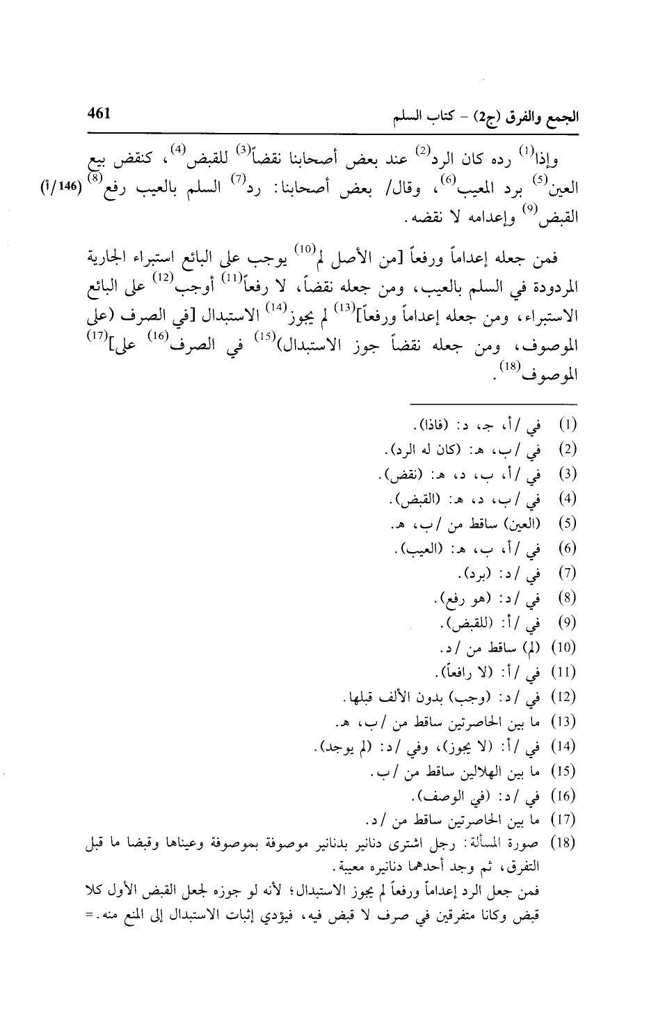 فمن جعله إعدامًا ورفعًا [من الأصل لم يوجب على البائع استبراء الجارية المردودة في السلم بالعيب، ومن جعله نقضًا، لا رفعًا أوجب على البائع الاستبراء، ومن جعله إعدامًا ورفعًا] لم يجوز الاستبدال [في الصرف (على الموصوف، ومن جعله نقضًا جوز الاستبدال) في الصرف على] الموصوف.