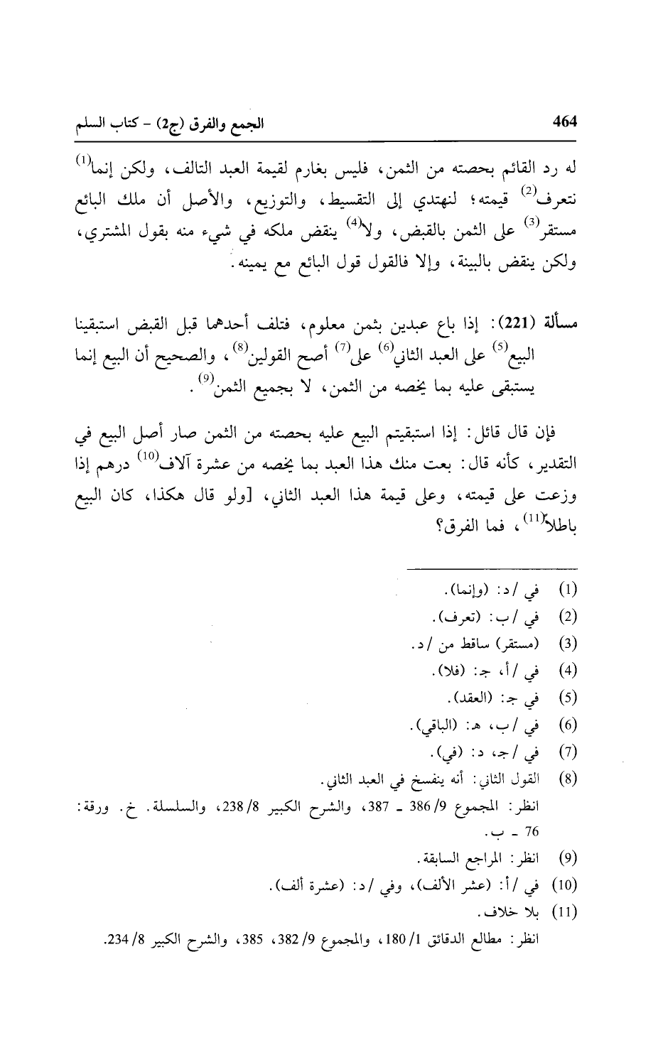 مسألة (٢٢١): إذا باع عبدين بثمن معلوم، فتلف أحدهما قبل القبض استبقينا البيع على العبد الثاني على أصح القولين، والصحيح أن البيع إنما يستبقى عليه بما يخصه من الثمن، لا بجميع الثمن.
