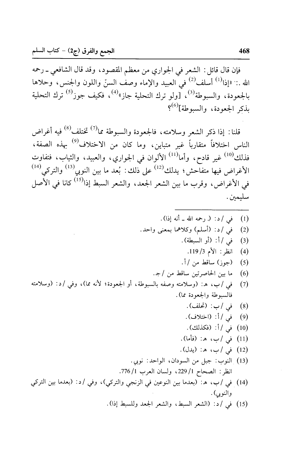 قلنا: إذا ذكر الشعر وسلامته، فالجعودة والسبوطة مما تختلف فيه أغراض الناس اختلافًا متقاربًا غير متباين، ومن كان من الاختلاف بهذه الصفة فذلك غير قادح، وأما الألوان في الجواري، والعبيد، والثياب، فتفاوت الأغراض فيها متفاحش؛ يدلك على ذلك: بُعد ما بين النوبي والتركي في الأغراض، وقرب ما بين الشعر الجعد، والشعر السبط إذا كانا في الأصل سليمين.