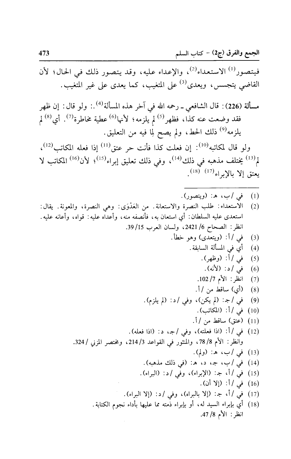 مسألة (٢٢٦): قال الشافعي - رحمه الله في آخر هذه المسألة: - ولو قال: إن ظهر فقد وضعت عنه كذا، فظهر لم يلزمه؛ لأنها عطية مخاطرة. أي لم يلزمه ذلك الحط، ولم يصح لما فيه من التعليق.