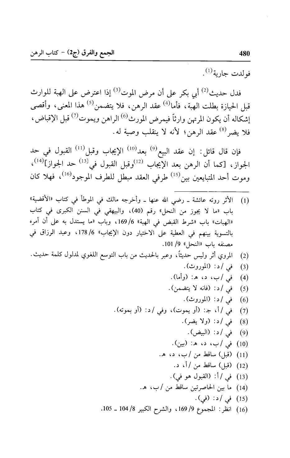 فدل حديث أبي بكر على أن مرض الموت إذا اعترض على الهبة للوارث قبل الحيازة بطلت الهبة، فأما عقد الرهن، فلا يتضمن هذا المعنى، وأقصى إشكاله أن يكون المرتهن وارثًا فيمرض المورث الراهن ويموت قبل الإقباض، فلا يضر عقد الرهن؛ لأنه لا ينقلب وصيه له.
