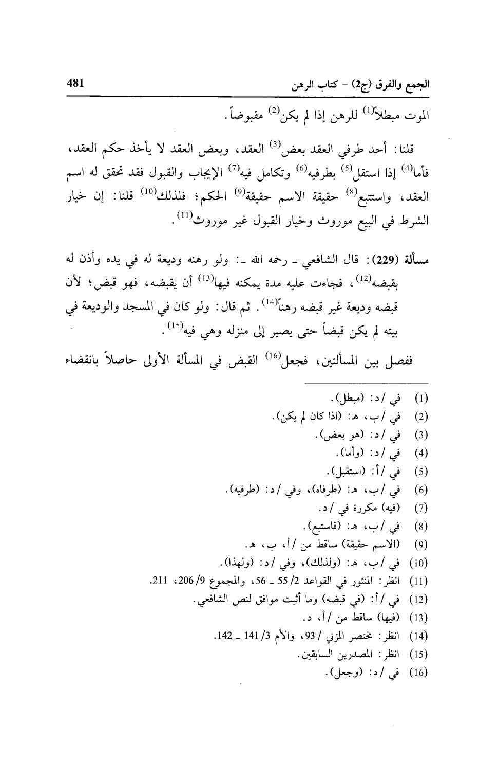 مسألة (٢٢٩): قال الشافعي - رحمه الله -: ولو رهنه وديعة له في يده وأذن له بقبضه، فجاءت عليه مدة يمكنه فيها أن يقبضه، فهو قبض؛ لأن قبضه وديعة غير قبضه رهنًا. ثم قال: ولو كان في المسجد والوديعة في بيته لم يكن قبضًا حتى يصير إلى منزله وهي فيه.