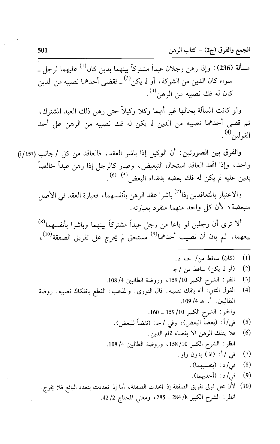 مسألة (٢٣٦): وإذا رهن رجلان عبدًا مشتركًا بينهما بدين كان عليهما لرجل -سواء كان الدين من الشركة، أو لم يكن- فقضي أحدهما نصيبه من الدين كان له فك نصيبه من الرهن.