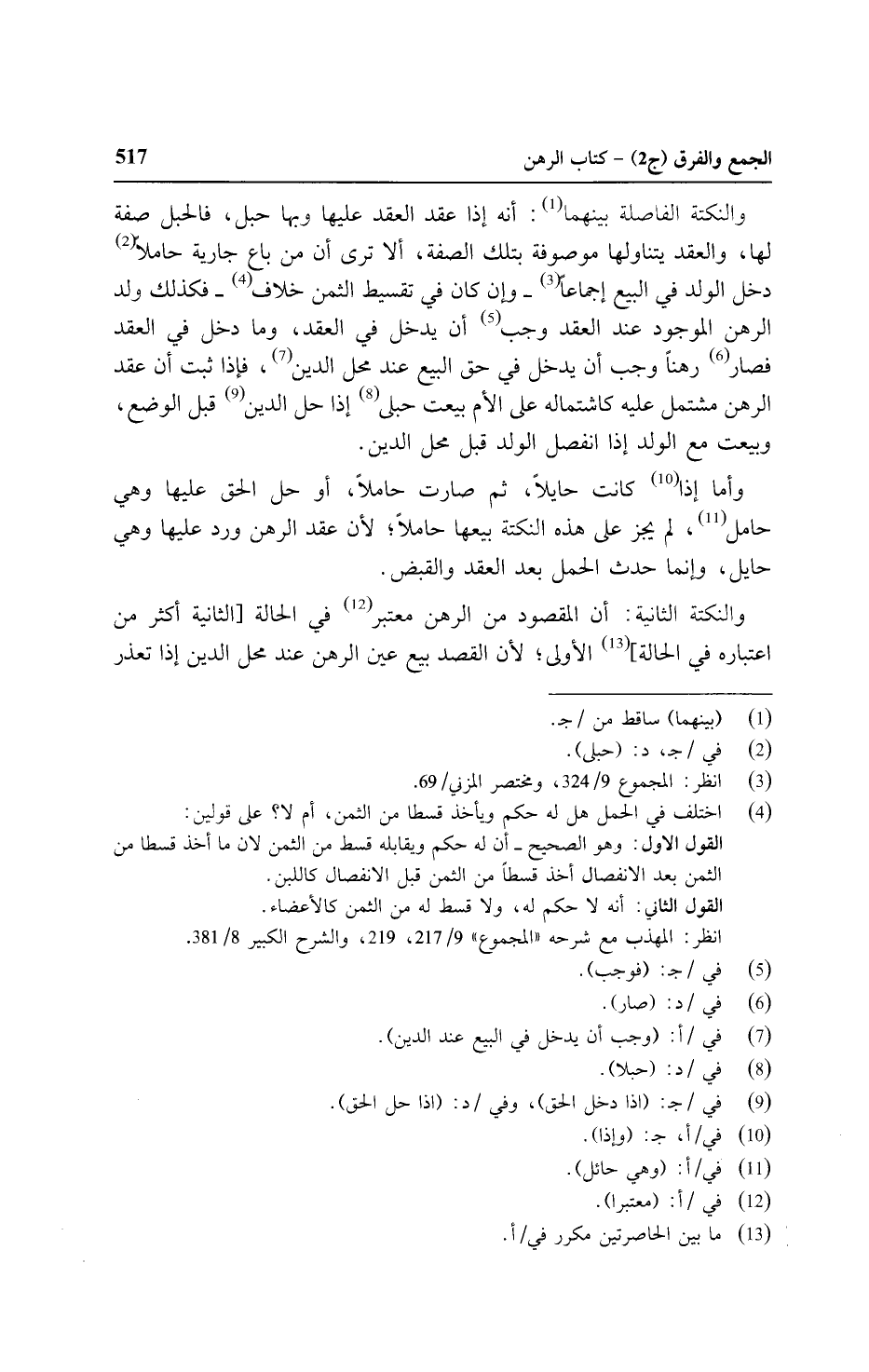 والنكتة الفاصلة بينهما: أنه إذا عقد العقد عليها وبها حبل، فالحبل صفة لها، والعقد يتناولها موصوفة بتلك الصفة، ألا ترى أن من باع جارية حاملا دخل الولد في البيع إجماعا -وإن كان في تقسيط الثمن خلاف- فكذلك ولد الرهن الموجود عند العقد وجب أن يدخل في العقد، وما دخل في العقد فصار رهنا وجب أن يدخل في حق البيع عند محل الدين، فإذا ثبت أن عقد الرهن مشتمل عليه كاشتماله على الأم بيعت حبلى إذا حل الدين قبل الوضع، وبيعت مع الولد إذا انفصل الولد قبل محل الدين.