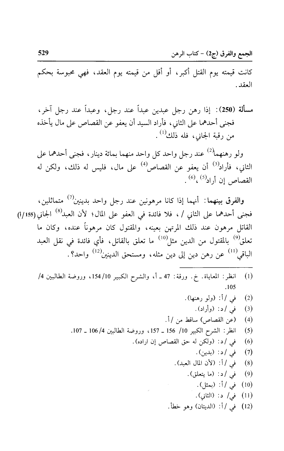 مسألة (٢٥٠): إذا رهن الرجل عبدين عبدا عند رجل، وعبدا عند رجل آخر فجني أحدهما على الثاني، فأراد السيد أان يعفو عن القصاص على مال يأخذه من رقبة الجاني، فله ذلك.