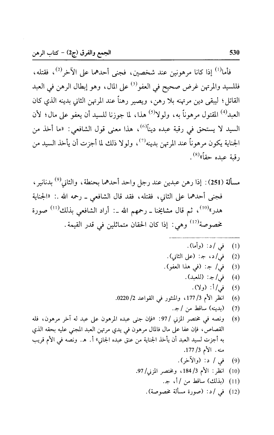 مسألة (٢٥١): إذا رهن عبدين عند رجل واحد أحدهما بحنطة، والثاني بدنانير, فجني أحدهما على القاني، فقتله فقد قال الشافعي - رحمه الله: " الجناية هدر" ثم قال مشايخنا - رحمهم الله: أراد الشافعي بذلك صورة مخصوصة وهي: إذا كان الحقان متماثلين في قدر القيمة.