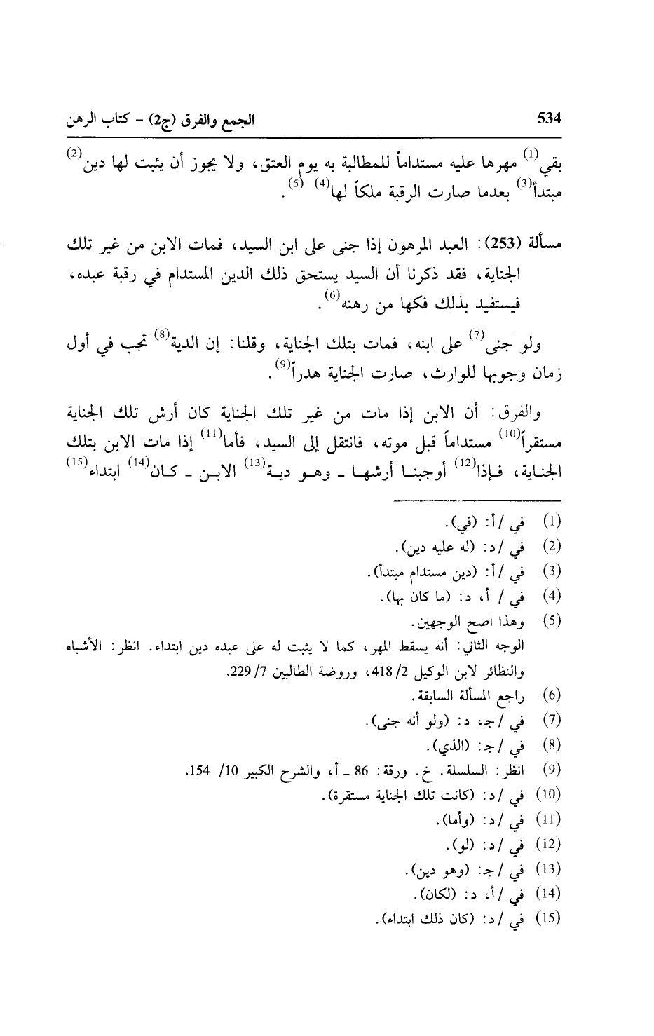 مسألة (٢٥٣): العبد المرهون إذا جني على ابن السيد, فمات الابن من غير تلك الجناية, فقد ذكرنا أن السيد يستحق ذلك الدين المستدام في رقبة عبده, فيستفيد بذلك فكها من رهنه. ولو جني على ابنه, فمات بتلك الجناية, وقلنا: إن الدية تجب في أول زمان وجوبها للوارث, صارت الجناية هدرا.