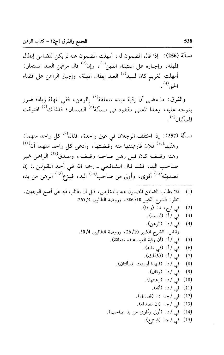 والفرق: ما مضى أن رقبة عبده متعلقة بالرهن, ففي المهلة زيادة ضرر يتوجه عليه, وهذا المعنى مفقود في مسألة الضمان؛ فلذلك افترقت المسألتان.
