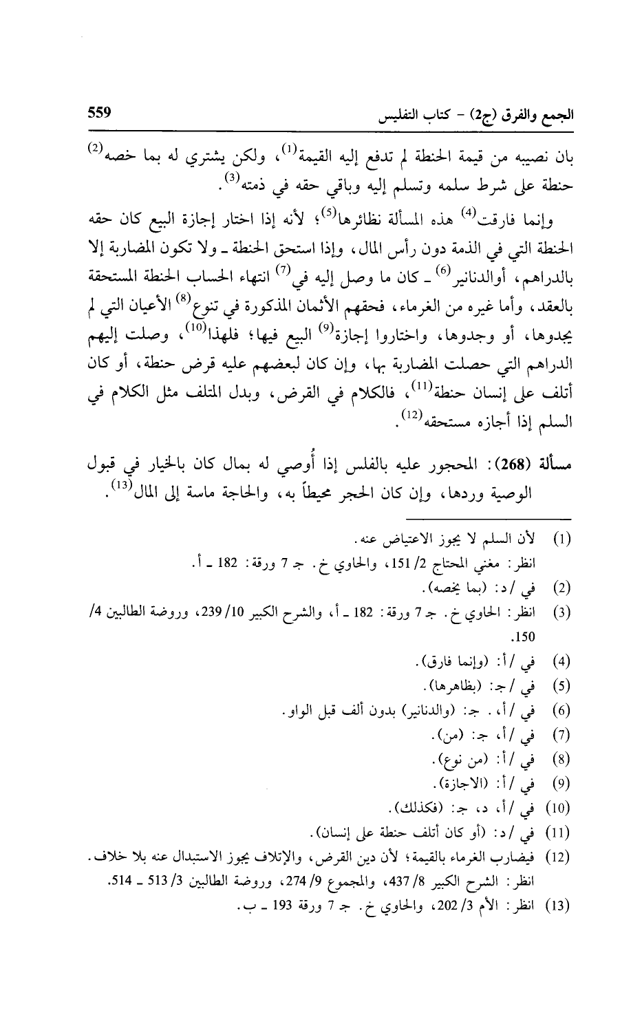 وإنما فارقت هذه المسألة نظائرها؛ لأنه إذا اختار إجازة البيع كان حقه الحنطة التي في الذمة دون رأس المال, وإذا استحق الحنطة - ولا تكون المضاربة إلا بالدراهم, أو الدنانير - كان ما وصل إليه في انتهاء الحساب الحنطة المستحقة بالعقد, وأما غيره من الغرماء, فخقهم الأثمان المذكورة في تنوع الأعيان التي لم يجدوها, أو وجدوها, واختاروا إجازة البيع فيها؛ فلهذا, وصلت إليهم الدراهم التي حصلت المضاربة بها, وإن كان لبعضهم عليه قرض حنطة, أو كان أتلف على إنسان حنطة, فالكلام في القرض, وبدل المتلف مثل الكلام في السلم إذا أجازه مستحقه.