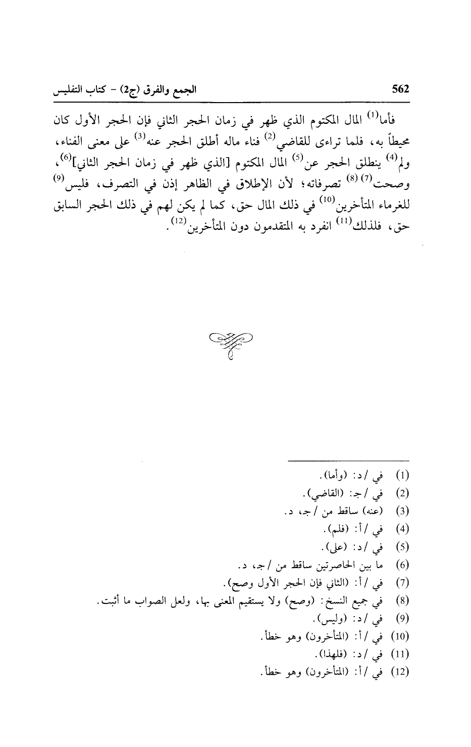 فأما المال المكتوم الذي ظهر في الحجر الثاني فإن الحجر الأول كان محبطًا به, فلما تراءى للقاضي فناء ماله أطلق الحجر عنه على معنى الفناء, ولم ينطلق الحجر عن المكتوم [الذي ظهر في زمان الحجر الثاني] , وصحت تصرفاته؛ لأن الإطلاق في الظاهر إذن في التصرف, فليس للغرماء المتأخرين في ذلك المال حق, كما لم يكن لهم في ذلك الحجر السابق حق, فلذلك انفرد به المتقدمون دون المتأخرين.