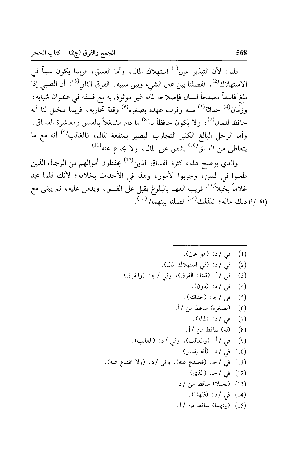 والذي يوضح هذا, كثرة الفساق الذين يحفظون أموالهم من الرجال الذين طعنوا في السن, وجربوا الأمور, وهذا في الأحداث بخلافه؛ لأنك قلما تجد غلامًا بخيلاً قريب العهد بالبلوغ يقبل على الفسق, ويدمن عليه, ثم يبقى مع ذلك ماله؛ فلذلك فصلنا بينهما/ (١٦١/أ).