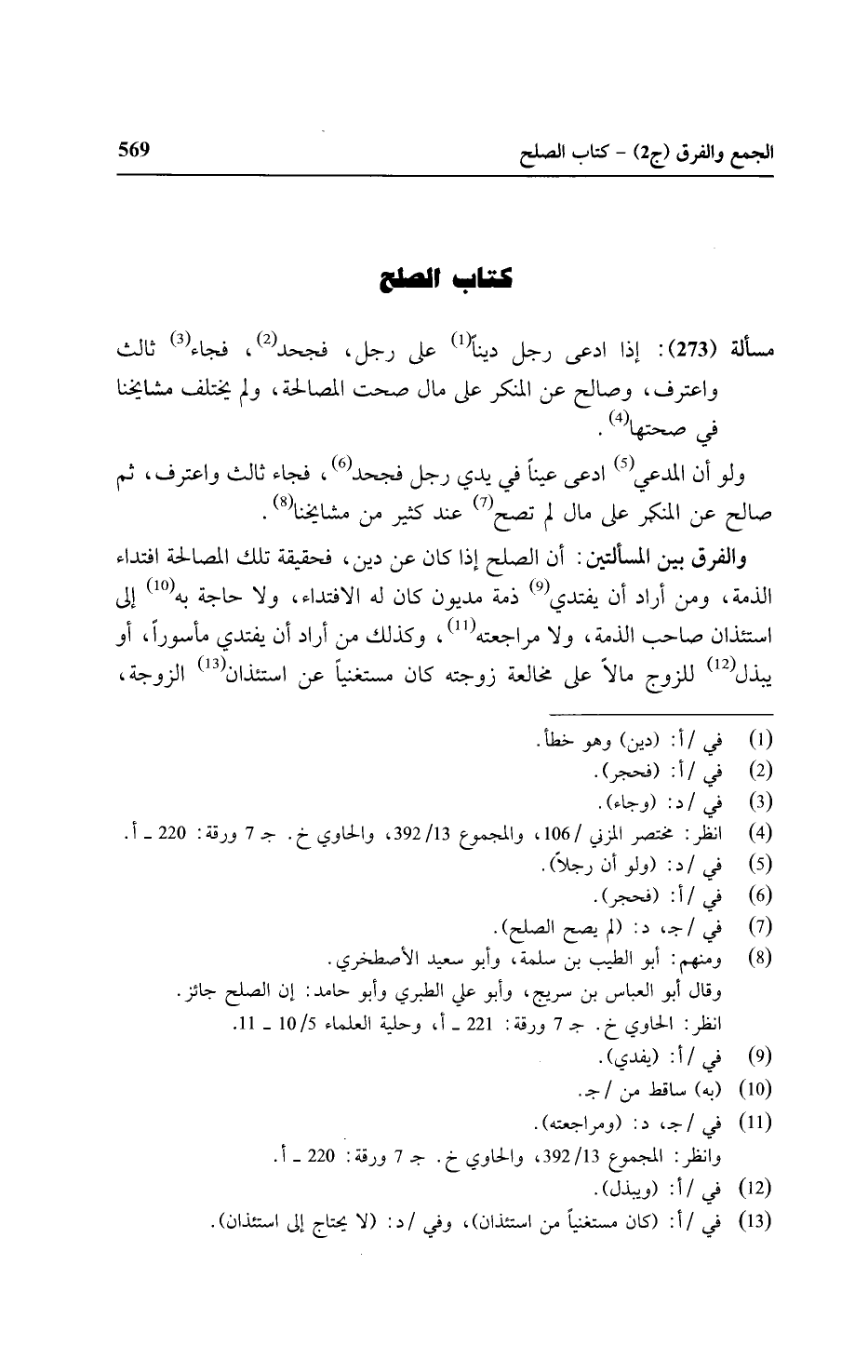 والفرق بين المسألتين: أن الصلح إذا كان عن دين, فحقيقة تلك المصالحة افتداء الذمة, ومن أراد أن يفتدي ذمة مديون كان له الافتداء، ولا حاجة به إلى استئذان صاحب الذمة, ولا مراجعته, وكذلك من أراد أن يفتدي مأسورًا, أو يبذل للزوج مالاً على مخالعة زوجته كان مستغنيًا عن استئذان الزوجة,