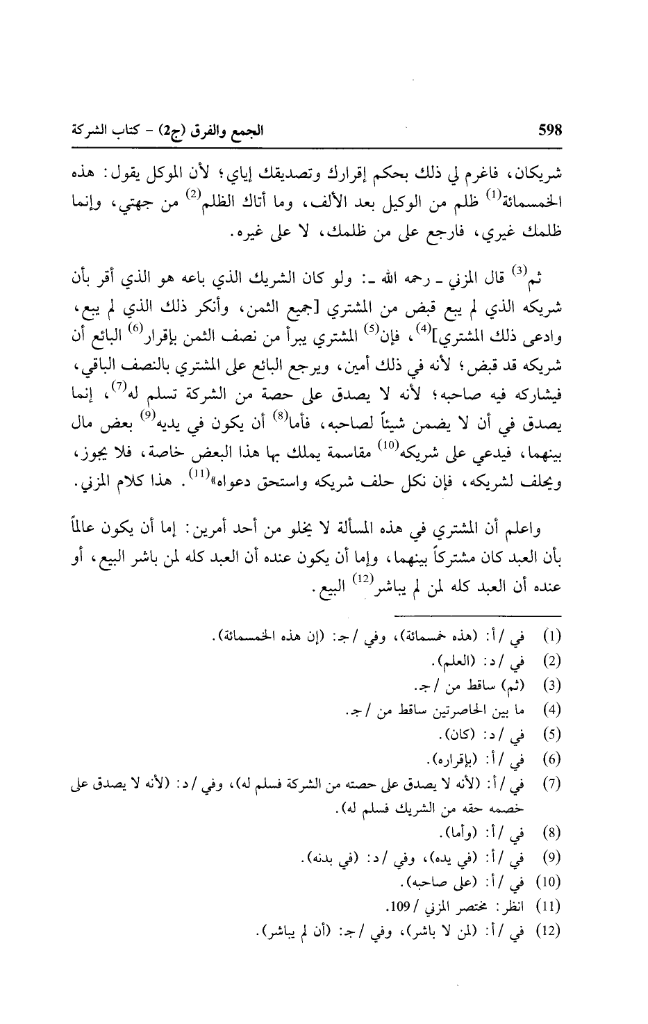 ثم قال المزني - رحمه الله -: ولو كان الشريك الذي باعه هو الذي أقر بأن شريكه الذي لم يبع قبض من المشتري] جميع الثمن, وأنكر ذلك الذي لم يبع, وادعى ذلك المشتري [, فإن المشتري يبرأ من نصف الثمن بإقرار البائع أن شريكه قد قبض؛ لأنه في ذلك أمين, ويرجع البائع على المشتري بالنصف الباقي, فيشاركه فيه صاحبه؛ لأنه لا يصدق على حصة من الشركة تسلم له, إنما يصدق في أن لا يضمن شيئًا لصاحبه, فأما أن يكون في يديه بعض مال بينهما, فيدعي على شريكه مقاسمة يملك بها هذا البعض خاصة, فلا يجوز, ويحلف لشريكه, فإن نكل حلف شريكه واستحق دعواه", هذا كلام المزني.
