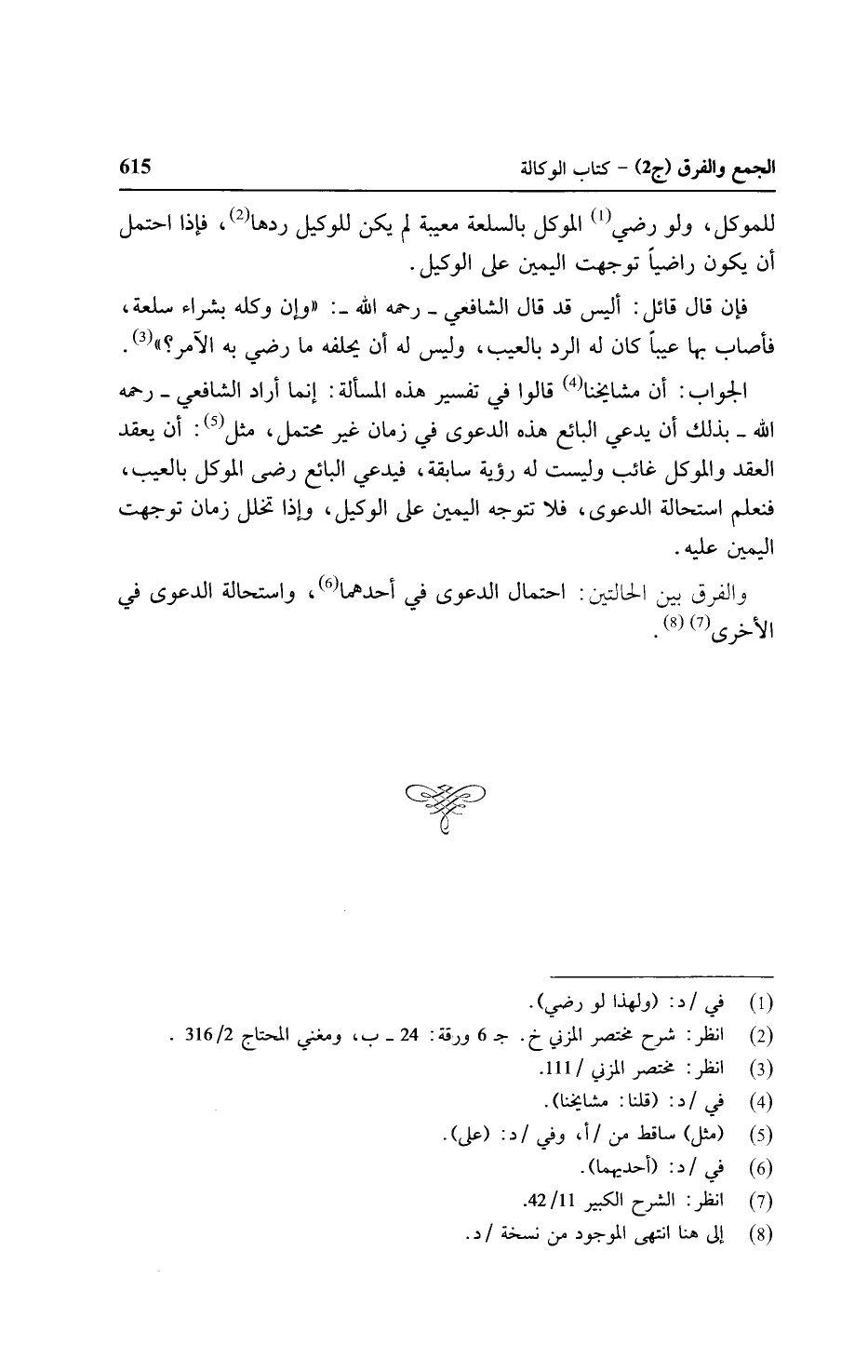 الجواب: أن مشايخنا قالوا في تفسير هذه المسألة: إنما أراد الشافعي - رحمه الله - بذلك أن يدعي البائع هذه الدعوى في زمان غير محتمل, مثل: أن يعقد العقد والموكل غائب وليست له رؤية سابقة, فيدعي البائع رضي الموكل بالعيب, فتعلم استحالة الدعوى, فلا تتوجه اليمين على الوكيل, وإذا تخلل زمان توجهت اليمين عليه.