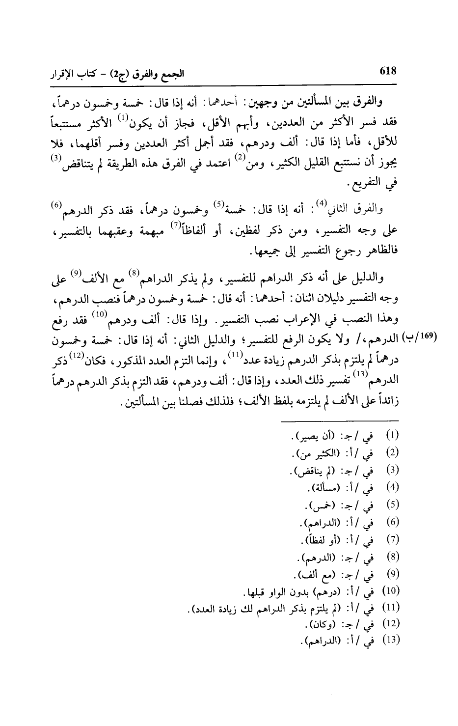 والفرق بين المسألتين من وجهين: أحدهما: أنه إذا قال: خمسة وخمسون درهمًا, فقد فسر الأكثر من العددين, وأيهم الأقل, فجاز أن يكون الأكثر مستتبعًا للأقل, فأما إذا قال: ألف ودرهم, فقد أجمل أكثر العددين وفسر أقلهما, فلا يجوز أن نستتبع القليل الكثير, ومن اعتمد في الفرق هذه الطريقة لم يتناقض في التفريع.