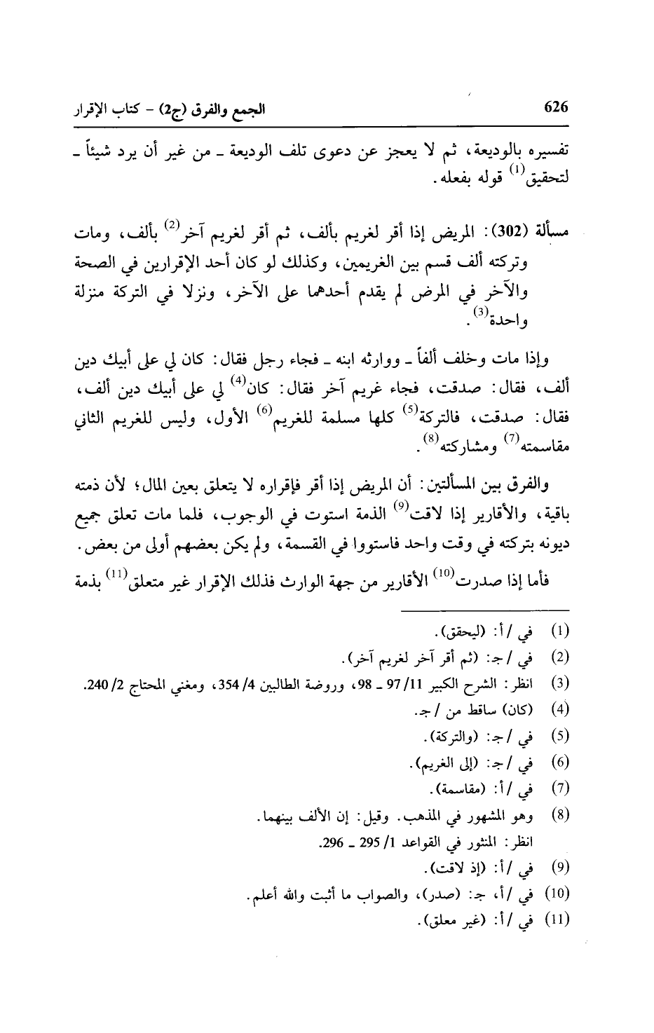 مسألة (٣٠٢): المريض إذا أقر لغريم بألف, ثم أقر لغريم آخر بألف, ومات وتركته ألف قسم بين الغريمين, وكذلك لو كان أحد الإقرارين في الصحة والآخر في المرض لم يقدم أحدهما على الآخر, ونزلا في التركة منزلة واحدة.