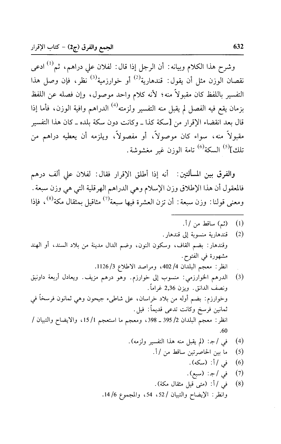 والفرق بين المسألتين: أنه إذا أطلق الإقرار فقال: لفلان علي ألف درهم فالمعقول أن هذا الإطلاق وزن الإسلام وهي الدرهم الهرقلية التي هي وزن سبعة, ومعنى قولنا: وزن سبعة: أن تزن العشرة فيها سبعة مثاقيل بمثقال مكة, فإذا