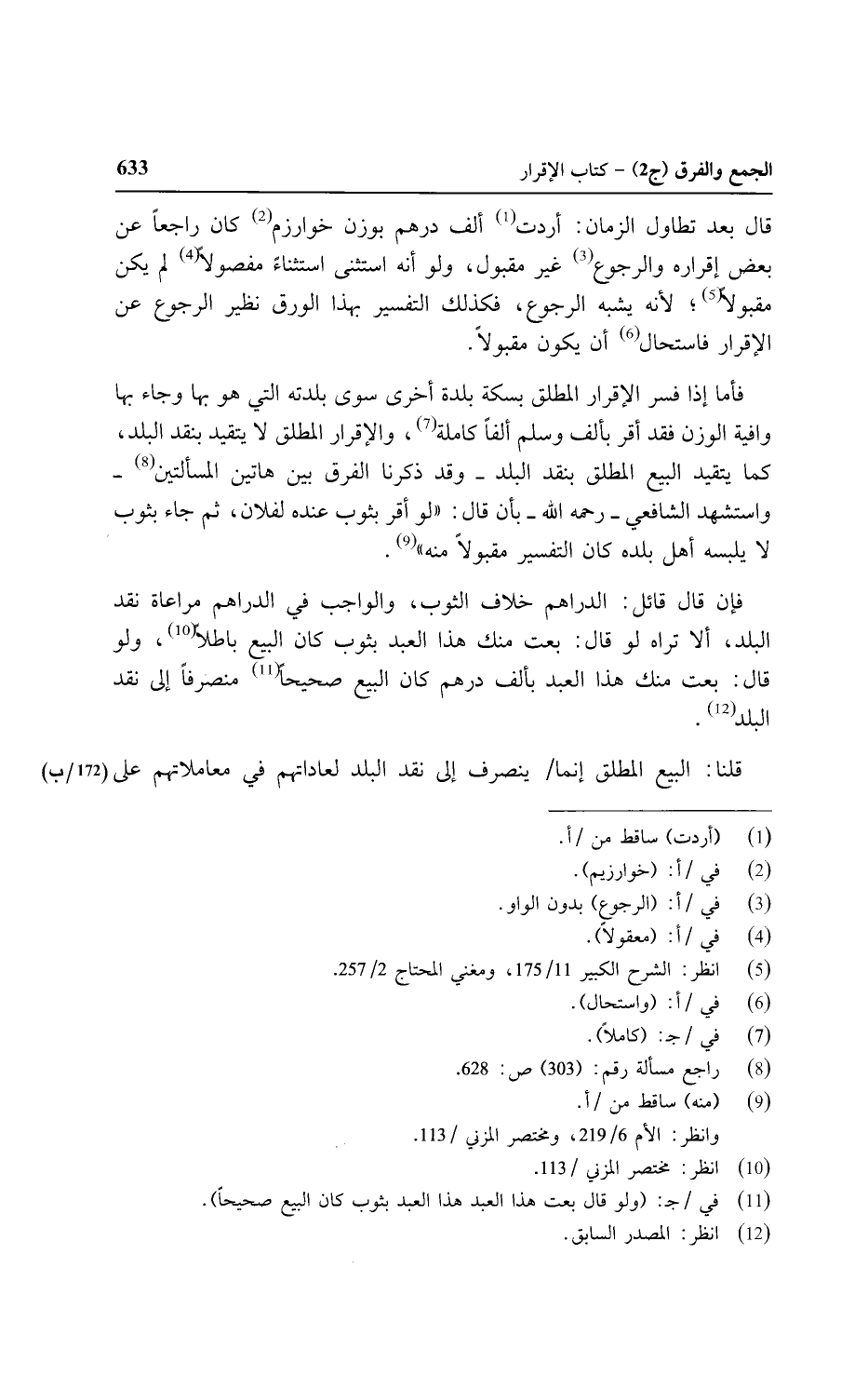 فأما إذا فسر الإقرار المطلق بسكة بلدة أخرى سوى بلدته التي هو بها وجاء بها وافية الوزن فقد أقر بألف وسلم ألفًا كاملة, والإقرار المطلق لا يتقيد بنقد البلد, كما يتقيد البيع المطلق بنقد البلد - وقد ذكرنا الفرق بين هاتين المسألتين - واستشهد الشافعي - رحمه الله - بأن قال: "لو أقر بثوب عنده لفلان, ثم جاء بثوب لا يلبسه أهل بلده كان التفسير مقبولًا".