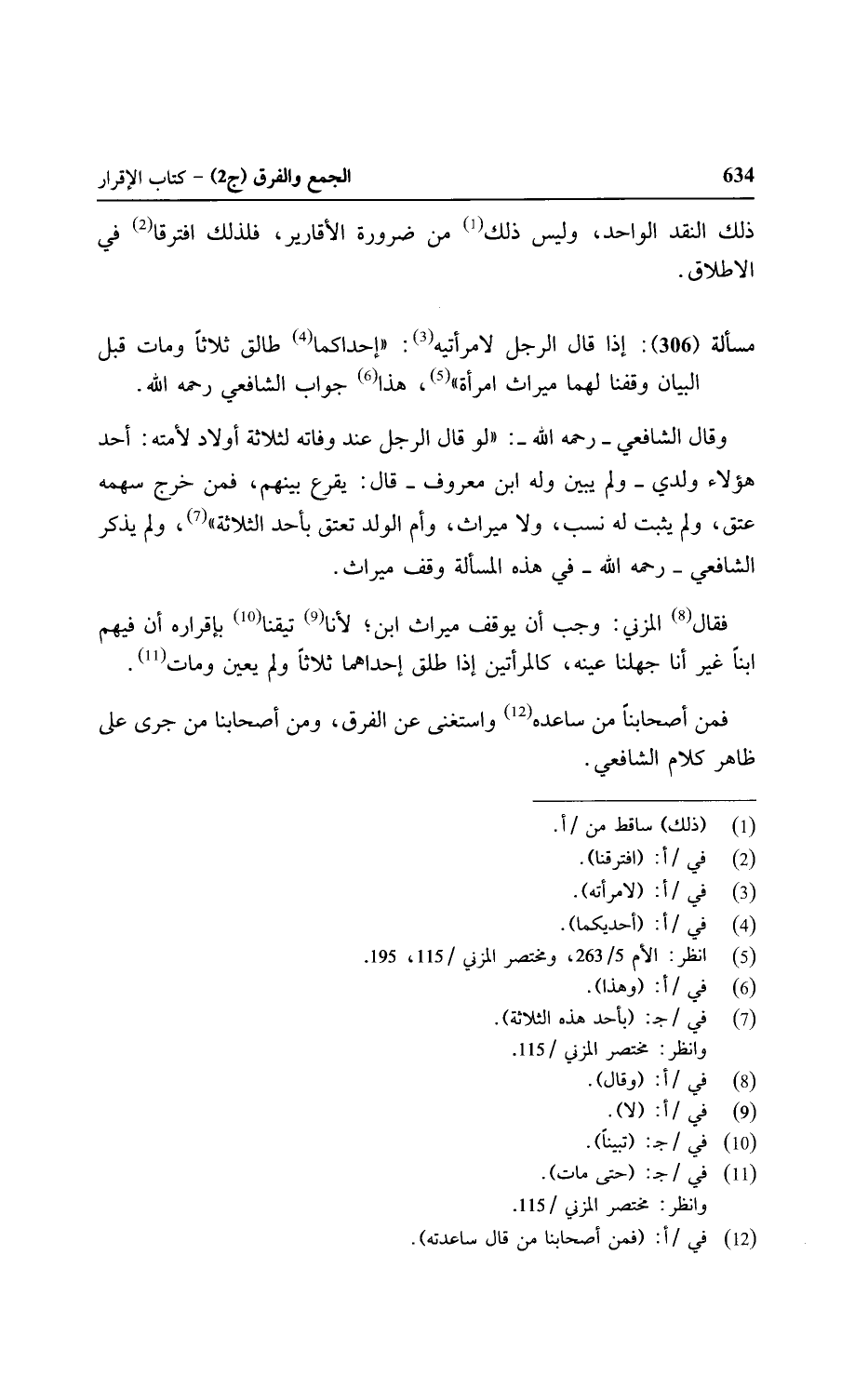 مسألة (٣٠٦): إذا قال الرجل لامرأتيه: "إحداكما طالق ثلاثًا ومات قبل البيان وقفنا لهما ميراث امرأة"، هذا جواب الشافعي رحمه الله.