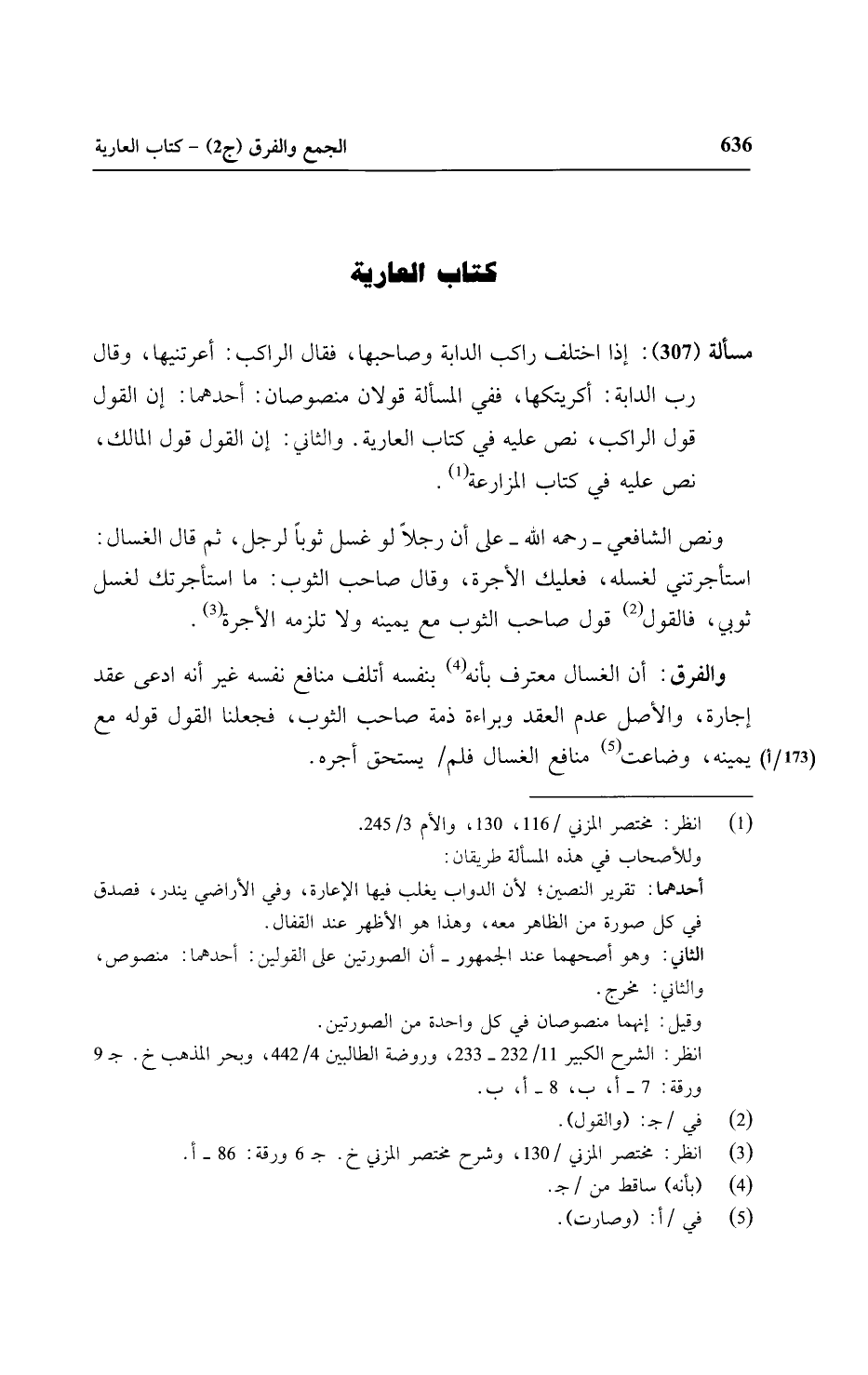 مسألة (٣٠٧): إذا اختلف راكب الدابة وصاحبها, فقال الراكب: أعرتنيها, وقال رب الدابة: أكريتكها, ففي المسألة قولان منصوصان: أحدهما: إن القول قول الراكب, نص عليه في كتاب العارية, والثاني: إن القول قول المالك, نص عليه في كتاب المزارعة.