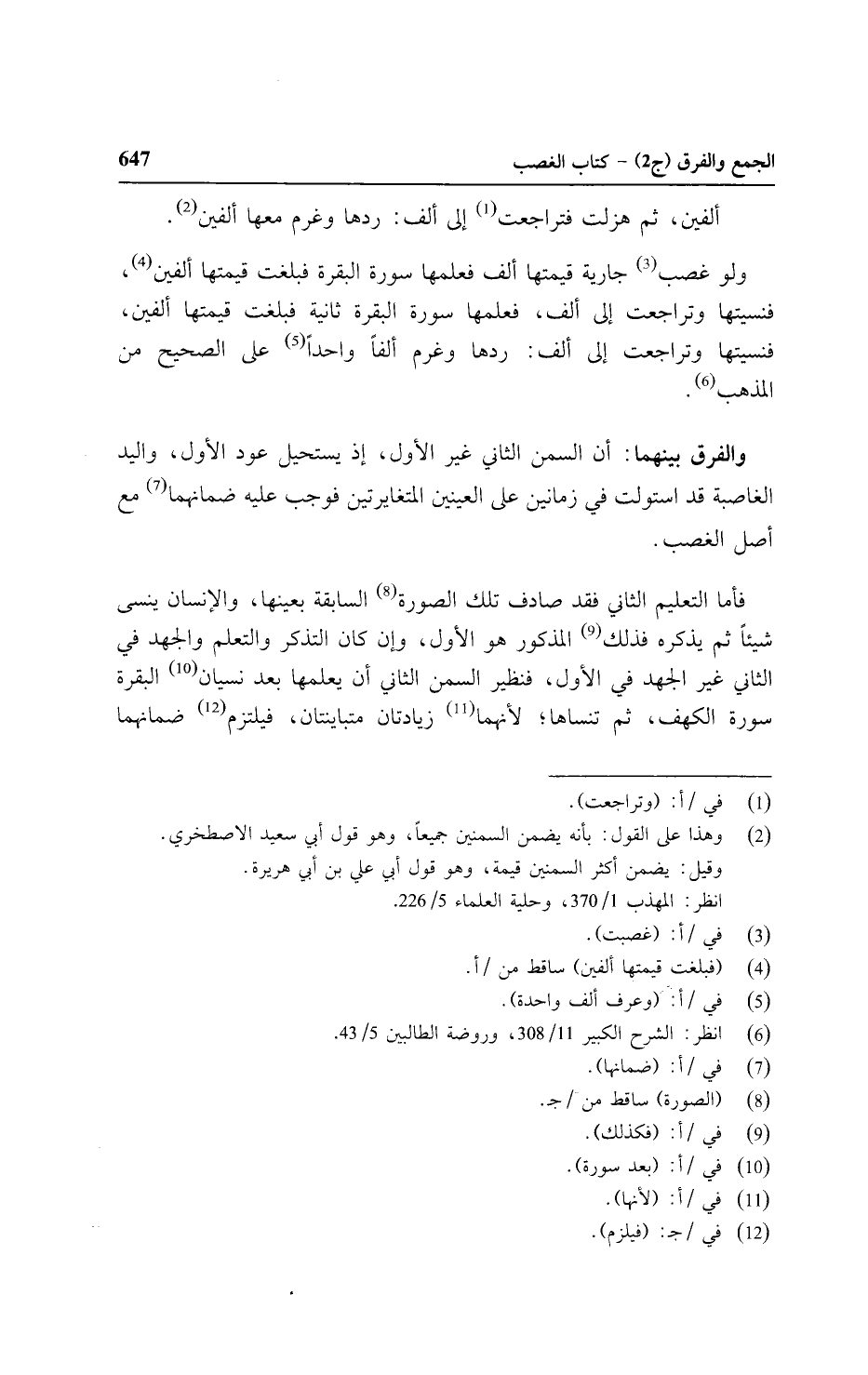 فأما التعليم الثاني فقد صادف تلك الصورة السابقة بعينها، والإنسان ينسى شيئًا ثم يذكره فذلك المذكور الأول، وإن كان التذكر والتعلم والجهد في الثاني غير الجهد في الأول، فنظير السمن الثاني أن يعلمها بعد نسيان البقرة سورة الكهف، ثم تنساها؛ لأنهما زيادتان متباينتان، فيلتزم ضمانهما